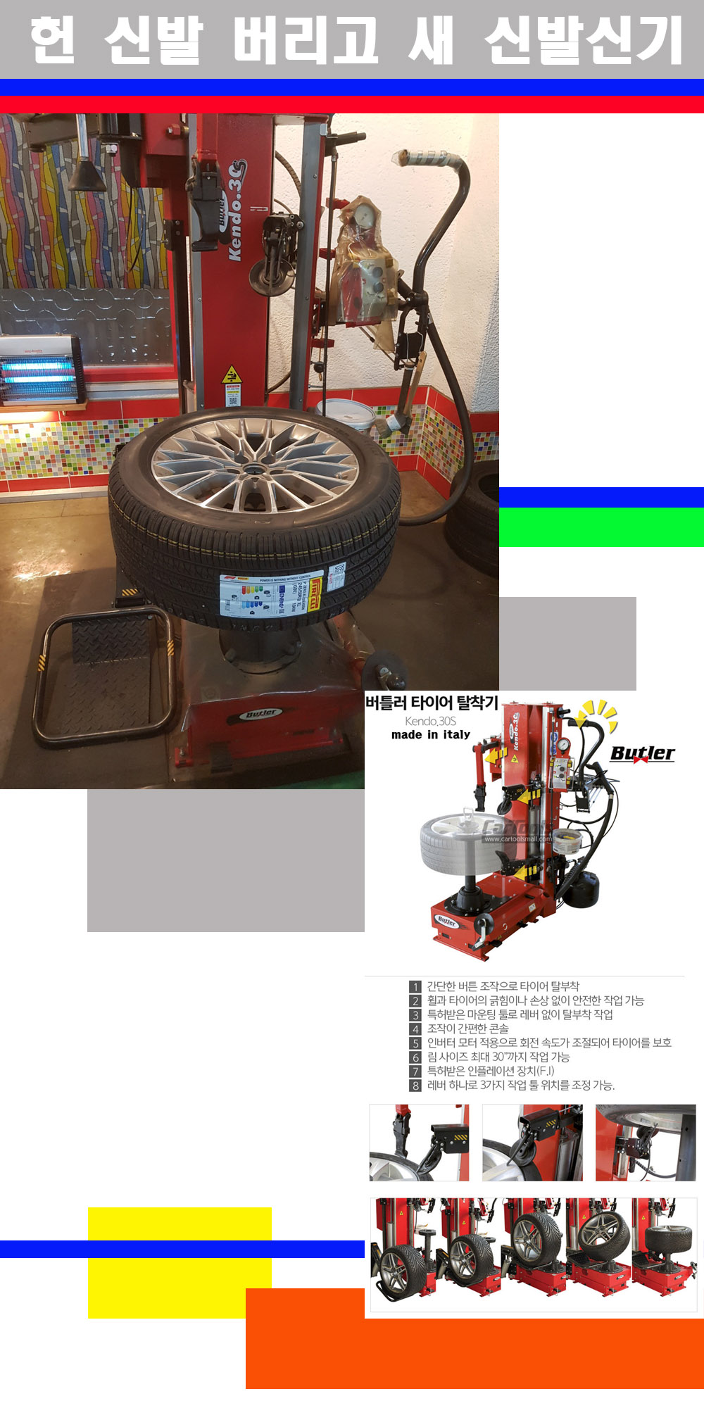 이태리 버틀러사의 켄도3.0S는 휠과 타이어와 조립과 분리시 전혀 제품에 손상을 주지않는 탈착기로 특히 센터락방식(중앙에서 휠를 고정하는 방식)이여서 휠의 중앙부위 잡아서 타이어를 탈부착하고 이후 상하롤러로 타이어를 탈부착합니다 특히 유니포미티작업(휠의 가장가벼운부분과 타이어의 가장 무거운부분을 매칭시키는 작업)시 작업자가 타이어를 정확한 지점에 휠과 매칭시킬수 있는 장점도 있습니다 유니포미티작업 불량시 과도한 진동값으로 핸들링불안 승차감저하 과도한 노면의 충격흡수를 가져와 주행감성을 해치는 첫번째 이유입니다 하지만 이런 작업을 무시하고 그냥 정적인 휠발란스작업만 하는것이 현실입니다 보통 타이어가격만 생각하시고 장착을 하시는데 꼭 이런 부분까지 챙길수 있는 샵을 권장합니다