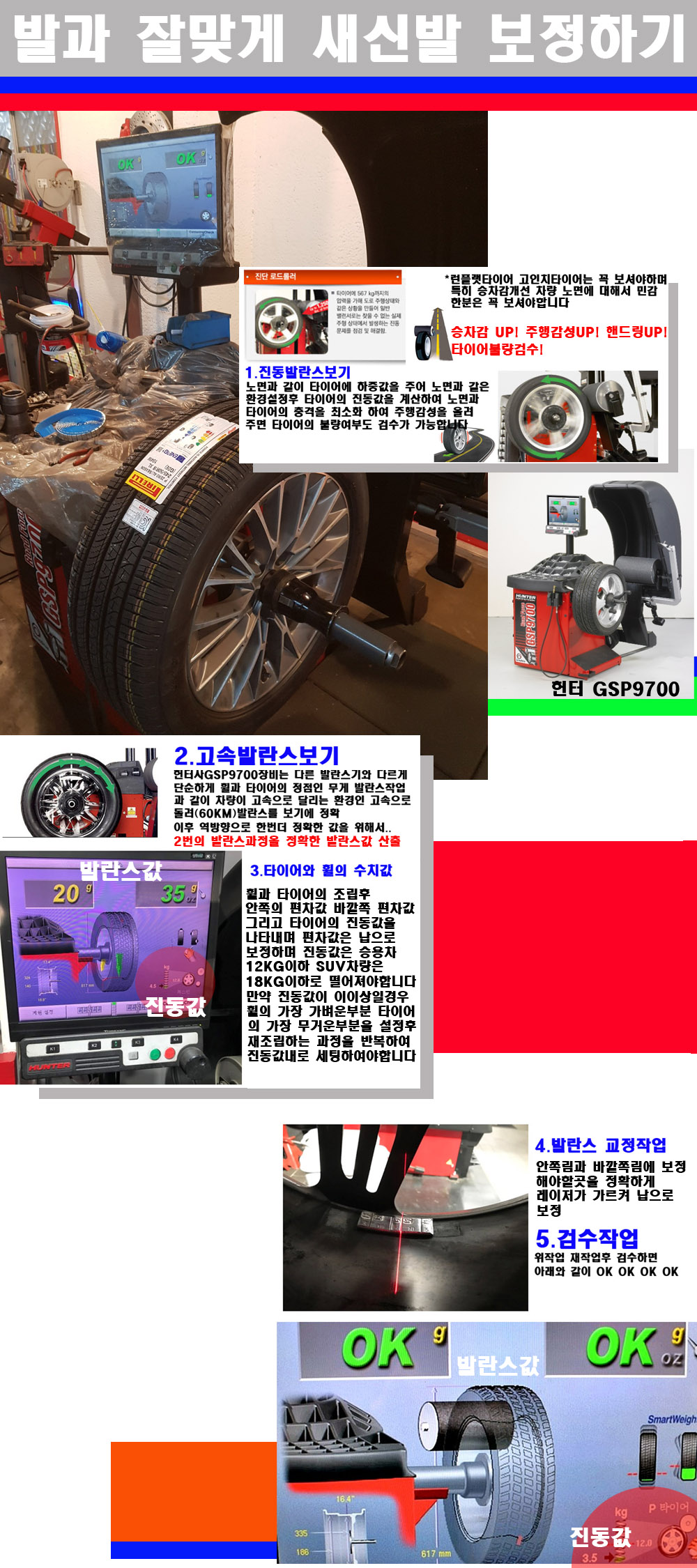 이후 미국 헌터사 GSP9700장비로 고속 및 진동발란스로 더욱더 작업의 정확도와 정밀도를 높였습니다 이장비는 노면에서 올라오는 진동값까지 계산하여 발란스값을 보는 방식으로 진동발란스기는 헌터사GSP9700장비가 유일합니다 이후 역방향으로 60키로의 고속으로 다시 발란스값을 보정하는 방식입니다 그래서 노면에서 올라오는 진동를 잡을수 있으며 특히 타이어의 노면력 측정으로 타이어의 불량여부까지도 검수가 가능한 장비입니다 특히 고속발란스 측정시 타사 발란스기와 틀리게 고속으로 발란스를 보기에 차량이 고속으로 달리는 시뮤레이션 구현이 가능하여 정확한 발란스값을 볼수가 있습니다 그리고 작업자에게는 불필요한 발란스납을 붙이지 않아 미관상으로 좋고 납을 절약하는 고객님에게도윈이고 작업자에게도 윈윈할수 있는 장비입니다 그리고 시중에서 고속진동발란스라고 말하시는 샵들이 많은데 꼭아셔야하는것은 고속발란스는 말그대로 발란스를 볼때 고속으로 돌리기에 60키로 전후 그리고 진동값을 계산하기위해서는 발란스기에 진동롤러가 있어야합니다 그래서 미국헌터사 GSP9700장비가 유일합니다 다른 샵에서 말하는 발란스기는 고속진동발란스기능없는 일반발란스 기기입니다 이점 꼭 아시고 장착하시기를 바랍니다