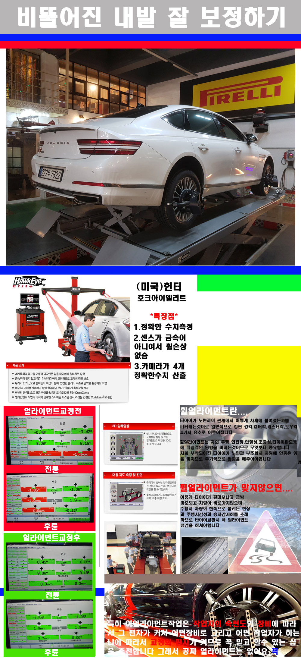이후 미국 헌터사 호크아이엘리트 장비로 3D얼라이먼트를 진행했습니다 이장비는 현존하는 가장 진화된 얼라이먼트장비입니다 특히 4개의 고성능카메라가 장착되어져 있어 실시간으로 오차가 없는 측정값을 구현하며 바퀴당 각 휠센서 클램프가 프라스틱이며 타이어바닦면을 지지하는 방식이여서 휠의 손상이 없는것이 특징입니다 하지만 장비보다 차량의 얼라이먼트를 볼시 작업자의 정성과 그리고 능력과 숙련도가 관견이기에 꼭 휠얼라이먼트를 장사수단으로 하지않는 샵을 권장합니다 자사는 얼라이먼트정렬시 교정전 교정후를 구분하여 고객님께 직접 이수치값을 확인시켜드리고 작업을 하며 이후 각각의 특성을 가진 타이어들에 대해서 설명 및 관리요령 운전요령 같이 설명해드리고 있습니다 이후 타이어와 휠의 정확한 발란스값과 진동값을 보정후 헌터사 호크아이엘리트 3D얼라이먼트장비로 공장에서 처음 출고될시의 팩토리값으로 교정하였습니다 그리고 타이어질소가스주입기로 3번정도 진공상태로 만든후 질소가스를 주입했습니다 질소가스주입시 가장 관견은 순도이기에 이런 여러번의 진공상태후 주입하고 빼주는 과정를 많이 해주어야합니다 질소가스의 주입시 타이어공기압의 저하가 덜하고 화합물질이 반응을 하지않아 소음전파력과 그리고 타이어안쪽에 수분을 발생하지않으며 타이어안쪽에서의 공기압이 팽창하지않아 타이어에 스트레스를 덜주게 됩니다 하지만 이부분도 공기속에 질소가 80%정도 존재하기에 미미한 차이이지만 질소순도를 높이고 주행시 좋은 점이 확연히 많기에 질소주입을 해드리고 있습니다 특히 고성능타이어나 하중값을 많이 주는 타이어일경우에는 위에서 언급한 부분에서 많이 차이를 보이고 있습니다 이후 타이어왁싱후 출고했습니다+ 감사합니다