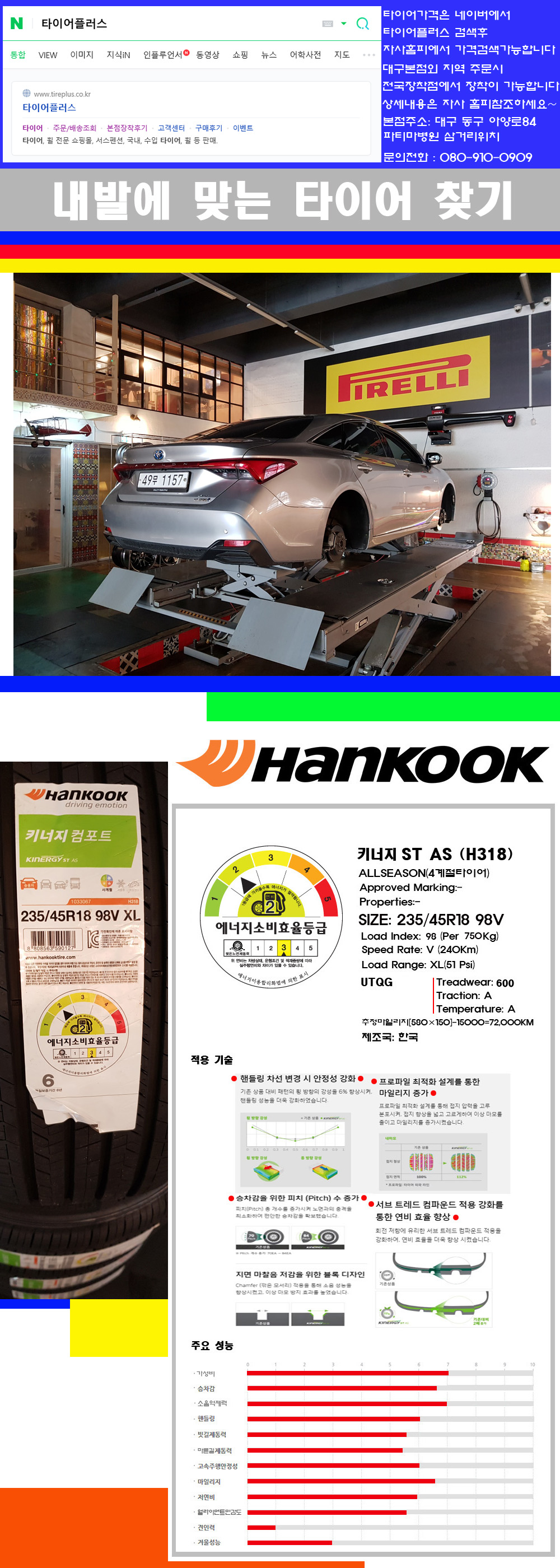♥♥♥본점 대구 동구 아양로84 (파티마삼거리 위치) 국산 수입타이어 할인행사중♥♥♥ 타이어플러스 대구본점은 전국에서 가장 규모가 큰매장입니다 물론 자사는 지하층 지상4층건물이며 1층작업장이외는 모두 창고로 사용중인 회사입니다 대구광역시 동구 아양로84(파티마병원 네거리에 위치)그래서 매장으로 바로 오시면 당일에 바로 장착이 가능합니다 물론 한국 금호 넥센 브리지스톤 미쉐린 콘티넨탈 피렐리 던롭 굳이어 요코하마 등 세계유수의 10대 브랜드타이어만 취급하고 있습니다 타이어매장중 단일규모로는 아마 전국에서 제일 커지않을까 생각합니다 가격도 인터넷 최저가로 장착해 드리고 있습니다 고객님들이 오시면서 너무 고급스러워 가격도 비싸지 않을까 생각하시는데 네이버에서 타이어플러스사이트를 검색해보시면 가격 또한 정말 싸게 판매하고 있구나 하고 생각하실것입니다 물론 장비도 현존하는 장비중 가장 최신장비와 그리고 유럽풍 인테리어의 최고급매장입니다 무엇하나 정품만 취급하며 작업또한 꼼꼼하게 매뉴얼에 따라서 작업을 해드립니다 특히 사장님의 이력이 화려한데 자동차경주 레이스와 미캐닉 국제자격증(A)소지자로서 경험한 풍부한 자동차의 지식을 갖춘분이십니다 특히 자동차잡지사에 타이어에 관한 내용도 기재하신 분이며 타이어회사의 타이어테스트드라이브로도 참여한 분이십니다 제품의 품질이나 제품의 성능등을 장사수단으로 말하지 않고 있는 그대로 말해드리며 특히 사장님 성격상 거짓말을 못하는 성격이여서 믿고 맡겨주시면 후회하지 않을 것입니다 그래서 사장님께서 직접상담해주시고 장착도 해주시는 매장이기에 더 신뢰가 가지 않을까 생각합니다 자사는 인터넷 최저가 기반으로 성장한 회사이기에 가격또한 인터넷 최저가로 장착해 드리고 있습니다 그리고 자사는 고객만족도에서 대상까지 수상한 회사입니다 그래서 한번 저의 매장에서 작업하신 고객님은 아마 다른곳에서는 아마 눈에 차지 않을것이라 생각합니다 가격이면 가격 작업의 완성도면 완성도 그리고 사후 관리까지 최고중에 최고가 되기위해서 노력하는 매장입니다 지금까지 어느 매장에서도 느끼지 못한 감성들을 느끼시기를 바랍니다 감사합니다