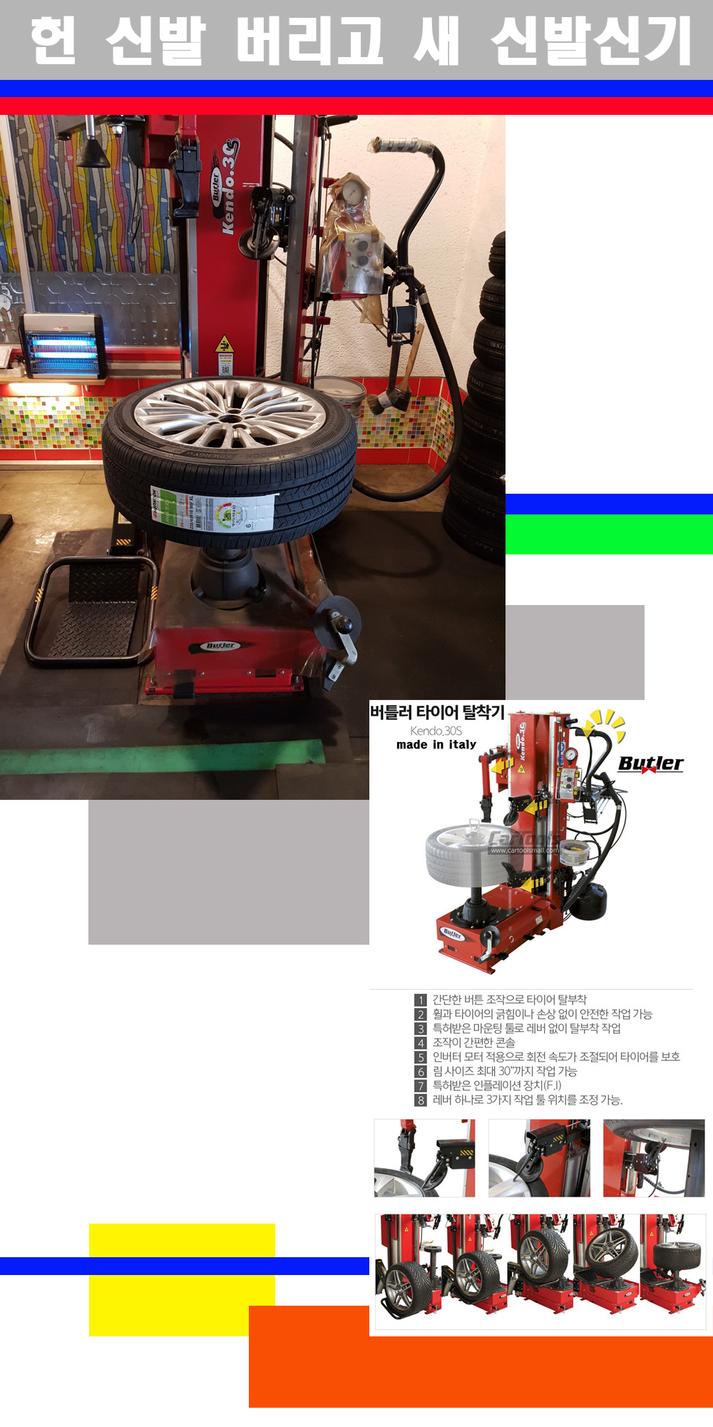 이태리 버틀러사의 켄도3.0S는 휠과 타이어와 조립과 분리시 전혀 제품에 손상을 주지않는 탈착기로 특히 센터락방식(중앙에서 휠를 고정하는 방식)이여서 휠의 중앙부위 잡아서 타이어를 탈부착하고 이후 상하롤러로 타이어를 탈부착합니다 특히 유니포미티작업(휠의 가장가벼운부분과 타이어의 가장 무거운부분을 매칭시키는 작업)시 작업자가 타이어를 정확한 지점에 휠과 매칭시킬수 있는 장점도 있습니다 유니포미티작업 불량시 과도한 진동값으로 핸들링불안 승차감저하 과도한 노면의 충격흡수를 가져와 주행감성을 해치는 첫번째 이유입니다 하지만 이런 작업을 무시하고 그냥 정적인 휠발란스작업만 하는것이 현실입니다 보통 타이어가격만 생각하시고 장착을 하시는데 꼭 이런 부분까지 챙길수 있는 샵을 권장합니다