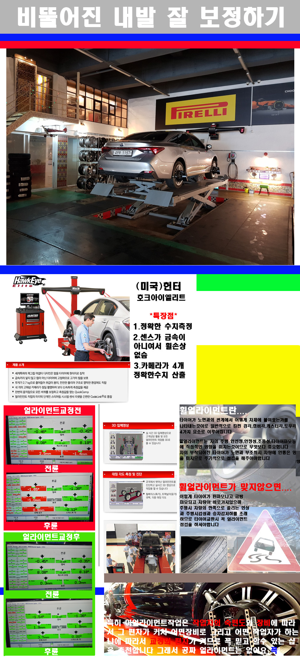 이후 미국 헌터사 호크아이엘리트 장비로 3D얼라이먼트를 진행했습니다 이장비는 현존하는 가장 진화된 얼라이먼트장비입니다 특히 4개의 고성능카메라가 장착되어져 있어 실시간으로 오차가 없는 측정값을 구현하며 바퀴당 각 휠센서 클램프가 프라스틱이며 타이어바닦면을 지지하는 방식이여서 휠의 손상이 없는것이 특징입니다 하지만 장비보다 차량의 얼라이먼트를 볼시 작업자의 정성과 그리고 능력과 숙련도가 관견이기에 꼭 휠얼라이먼트를 장사수단으로 하지않는 샵을 권장합니다 자사는 얼라이먼트정렬시 교정전 교정후를 구분하여 고객님께 직접 이수치값을 확인시켜드리고 작업을 하며 이후 각각의 특성을 가진 타이어들에 대해서 설명 및 관리요령 운전요령 같이 설명해드리고 있습니다 이후 타이어와 휠의 정확한 발란스값과 진동값을 보정후 헌터사 호크아이엘리트 3D얼라이먼트장비로 공장에서 처음 출고될시의 팩토리값으로 교정하였습니다 그리고 타이어질소가스주입기로 3번정도 진공상태로 만든후 질소가스를 주입했습니다 질소가스주입시 가장 관견은 순도이기에 이런 여러번의 진공상태후 주입하고 빼주는 과정를 많이 해주어야합니다 질소가스의 주입시 타이어공기압의 저하가 덜하고 화합물질이 반응을 하지않아 소음전파력과 그리고 타이어안쪽에 수분을 발생하지않으며 타이어안쪽에서의 공기압이 팽창하지않아 타이어에 스트레스를 덜주게 됩니다 하지만 이부분도 공기속에 질소가 80%정도 존재하기에 미미한 차이이지만 질소순도를 높이고 주행시 좋은 점이 확연히 많기에 질소주입을 해드리고 있습니다 특히 고성능타이어나 하중값을 많이 주는 타이어일경우에는 위에서 언급한 부분에서 많이 차이를 보이고 있습니다 이후 타이어왁싱후 출고했습니다+ 감사합니다