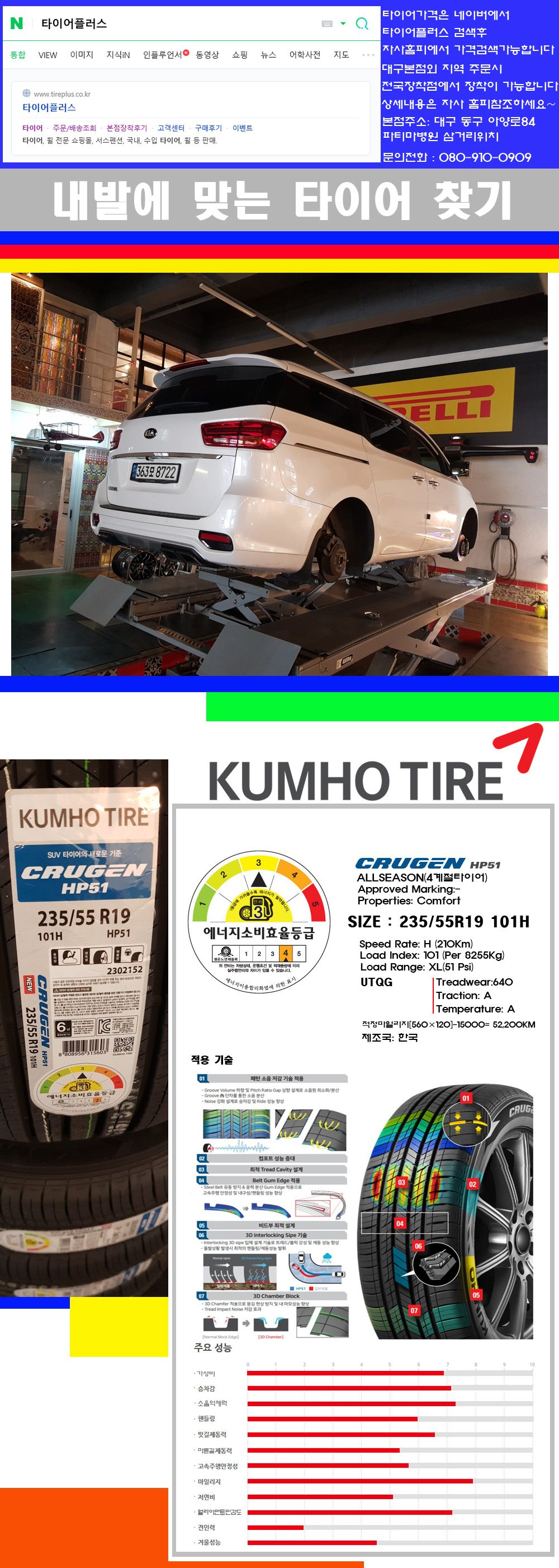 ♥♥♥본점 대구 동구 아양로84 (파티마삼거리 위치) 국산 수입타이어 할인행사중♥♥♥ 타이어플러스 대구본점은 전국에서 가장 규모가 큰매장입니다 물론 자사는 지하층 지상4층건물이며 1층작업장이외는 모두 창고로 사용중인 회사입니다 대구광역시 동구 아양로84(파티마병원 네거리에 위치)그래서 매장으로 바로 오시면 당일에 바로 장착이 가능합니다 물론 한국 금호 넥센 브리지스톤 미쉐린 콘티넨탈 피렐리 던롭 굳이어 요코하마 등 세계유수의 10대 브랜드타이어만 취급하고 있습니다 타이어매장중 단일규모로는 아마 전국에서 제일 커지않을까 생각합니다 가격도 인터넷 최저가로 장착해 드리고 있습니다 고객님들이 오시면서 너무 고급스러워 가격도 비싸지 않을까 생각하시는데 네이버에서 타이어플러스사이트를 검색해보시면 가격 또한 정말 싸게 판매하고 있구나 하고 생각하실것입니다 물론 장비도 현존하는 장비중 가장 최신장비와 그리고 유럽풍 인테리어의 최고급매장입니다 무엇하나 정품만 취급하며 작업또한 꼼꼼하게 매뉴얼에 따라서 작업을 해드립니다 특히 사장님의 이력이 화려한데 자동차경주 레이스와 미캐닉 국제자격증(A)소지자로서 경험한 풍부한 자동차의 지식을 갖춘분이십니다 특히 자동차잡지사에 타이어에 관한 내용도 기재하신 분이며 타이어회사의 타이어테스트드라이브로도 참여한 분이십니다 제품의 품질이나 제품의 성능등을 장사수단으로 말하지 않고 있는 그대로 말해드리며 특히 사장님 성격상 거짓말을 못하는 성격이여서 믿고 맡겨주시면 후회하지 않을 것입니다 그래서 사장님께서 직접상담해주시고 장착도 해주시는 매장이기에 더 신뢰가 가지 않을까 생각합니다 자사는 인터넷 최저가 기반으로 성장한 회사이기에 가격또한 인터넷 최저가로 장착해 드리고 있습니다 그리고 자사는 고객만족도에서 대상까지 수상한 회사입니다 그래서 한번 저의 매장에서 작업하신 고객님은 아마 다른곳에서는 아마 눈에 차지 않을것이라 생각합니다 가격이면 가격 작업의 완성도면 완성도 그리고 사후 관리까지 최고중에 최고가 되기위해서 노력하는 매장입니다 지금까지 어느 매장에서도 느끼지 못한 감성들을 느끼시기를 바랍니다 감사합니다