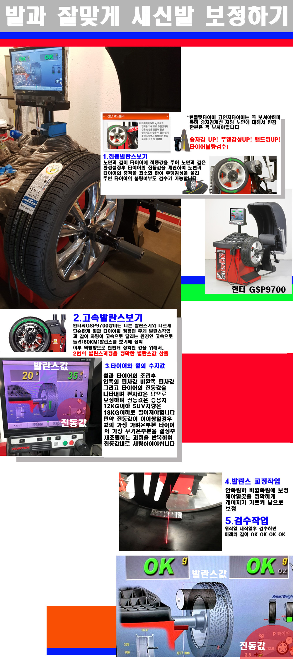 이후 미국 헌터사 GSP9700장비로 고속 및 진동발란스로 더욱더 작업의 정확도와 정밀도를 높였습니다 이장비는 노면에서 올라오는 진동값까지 계산하여 발란스값을 보는 방식으로 진동발란스기는 헌터사GSP9700장비가 유일합니다 이후 역방향으로 60키로의 고속으로 다시 발란스값을 보정하는 방식입니다 그래서 노면에서 올라오는 진동를 잡을수 있으며 특히 타이어의 노면력 측정으로 타이어의 불량여부까지도 검수가 가능한 장비입니다 특히 고속발란스 측정시 타사 발란스기와 틀리게 고속으로 발란스를 보기에 차량이 고속으로 달리는 시뮤레이션 구현이 가능하여 정확한 발란스값을 볼수가 있습니다 그리고 작업자에게는 불필요한 발란스납을 붙이지 않아 미관상으로 좋고 납을 절약하는 고객님에게도윈이고 작업자에게도 윈윈할수 있는 장비입니다 그리고 시중에서 고속진동발란스라고 말하시는 샵들이 많은데 꼭아셔야하는것은 고속발란스는 말그대로 발란스를 볼때 고속으로 돌리기에 60키로 전후 그리고 진동값을 계산하기위해서는 발란스기에 진동롤러가 있어야합니다 그래서 미국헌터사 GSP9700장비가 유일합니다 다른 샵에서 말하는 발란스기는 고속진동발란스기능없는 일반발란스 기기입니다 이점 꼭 아시고 장착하시기를 바랍니다