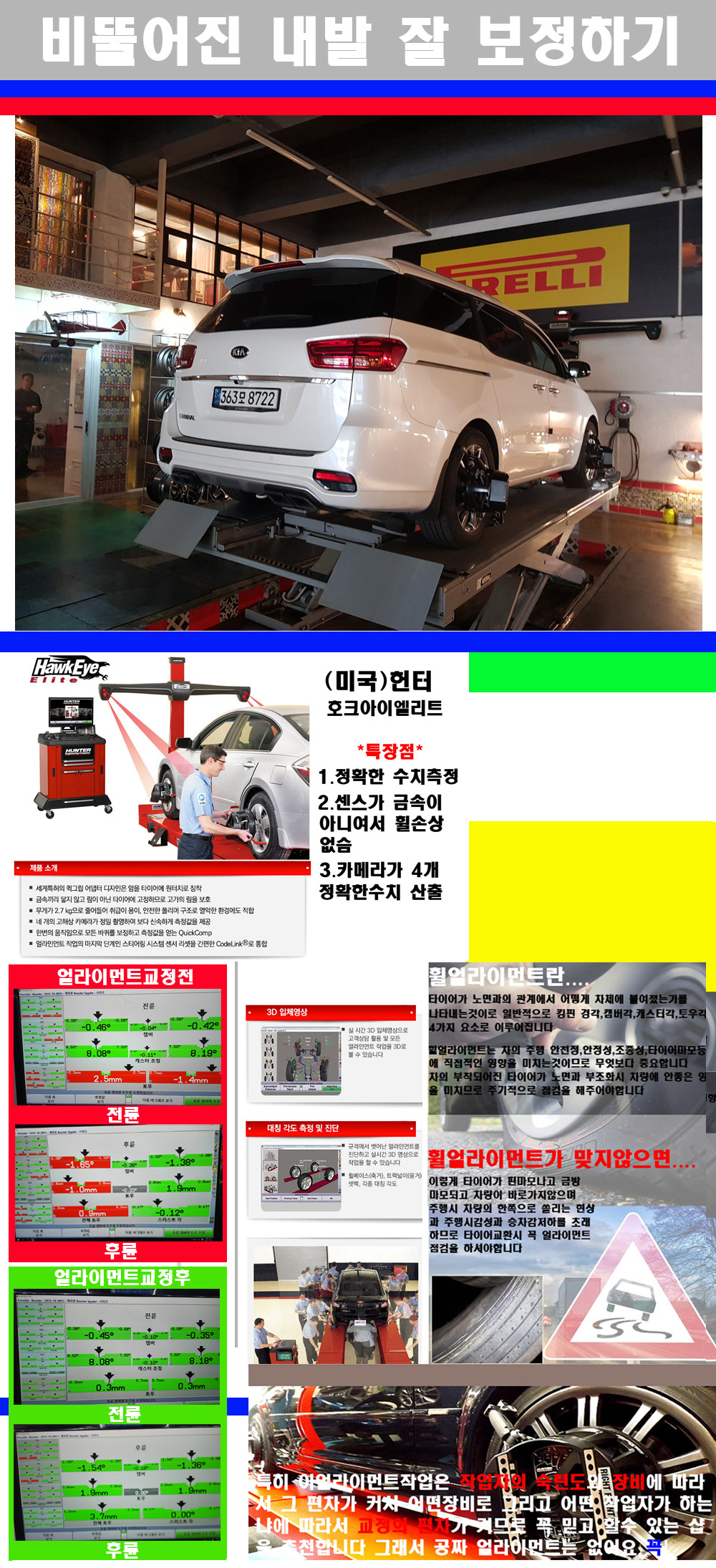 이후 미국 헌터사 호크아이엘리트 장비로 3D얼라이먼트를 진행했습니다 이장비는 현존하는 가장 진화된 얼라이먼트장비입니다 특히 4개의 고성능카메라가 장착되어져 있어 실시간으로 오차가 없는 측정값을 구현하며 바퀴당 각 휠센서 클램프가 프라스틱이며 타이어바닦면을 지지하는 방식이여서 휠의 손상이 없는것이 특징입니다 하지만 장비보다 차량의 얼라이먼트를 볼시 작업자의 정성과 그리고 능력과 숙련도가 관견이기에 꼭 휠얼라이먼트를 장사수단으로 하지않는 샵을 권장합니다 자사는 얼라이먼트정렬시 교정전 교정후를 구분하여 고객님께 직접 이수치값을 확인시켜드리고 작업을 하며 이후 각각의 특성을 가진 타이어들에 대해서 설명 및 관리요령 운전요령 같이 설명해드리고 있습니다 이후 타이어와 휠의 정확한 발란스값과 진동값을 보정후 헌터사 호크아이엘리트 3D얼라이먼트장비로 공장에서 처음 출고될시의 팩토리값으로 교정하였습니다 그리고 타이어질소가스주입기로 3번정도 진공상태로 만든후 질소가스를 주입했습니다 질소가스주입시 가장 관견은 순도이기에 이런 여러번의 진공상태후 주입하고 빼주는 과정를 많이 해주어야합니다 질소가스의 주입시 타이어공기압의 저하가 덜하고 화합물질이 반응을 하지않아 소음전파력과 그리고 타이어안쪽에 수분을 발생하지않으며 타이어안쪽에서의 공기압이 팽창하지않아 타이어에 스트레스를 덜주게 됩니다 하지만 이부분도 공기속에 질소가 80%정도 존재하기에 미미한 차이이지만 질소순도를 높이고 주행시 좋은 점이 확연히 많기에 질소주입을 해드리고 있습니다 특히 고성능타이어나 하중값을 많이 주는 타이어일경우에는 위에서 언급한 부분에서 많이 차이를 보이고 있습니다 이후 타이어왁싱후 출고했습니다+ 감사합니다