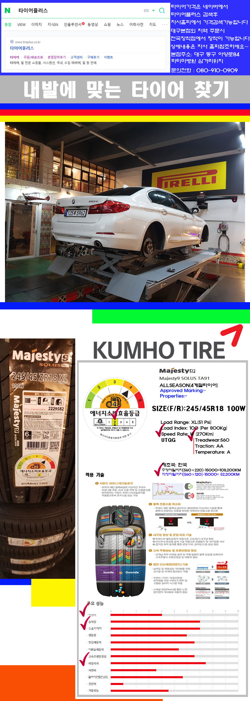 ♥♥♥본점 대구 동구 아양로84 (파티마삼거리 위치) 국산 수입타이어 할인행사중♥♥♥ 타이어플러스 대구본점은 전국에서 가장 규모가 큰매장입니다 물론 자사는 지하층 지상4층건물이며 1층작업장이외는 모두 창고로 사용중인 회사입니다 대구광역시 동구 아양로84(파티마병원 네거리에 위치)그래서 매장으로 바로 오시면 당일에 바로 장착이 가능합니다 물론 한국 금호 넥센 브리지스톤 미쉐린 콘티넨탈 피렐리 던롭 굳이어 요코하마 등 세계유수의 10대 브랜드타이어만 취급하고 있습니다 타이어매장중 단일규모로는 아마 전국에서 제일 커지않을까 생각합니다 가격도 인터넷 최저가로 장착해 드리고 있습니다 고객님들이 오시면서 너무 고급스러워 가격도 비싸지 않을까 생각하시는데 네이버에서 타이어플러스사이트를 검색해보시면 가격 또한 정말 싸게 판매하고 있구나 하고 생각하실것입니다 물론 장비도 현존하는 장비중 가장 최신장비와 그리고 유럽풍 인테리어의 최고급매장입니다 무엇하나 정품만 취급하며 작업또한 꼼꼼하게 매뉴얼에 따라서 작업을 해드립니다 특히 사장님의 이력이 화려한데 자동차경주 레이스와 미캐닉 국제자격증(A)소지자로서 경험한 풍부한 자동차의 지식을 갖춘분이십니다 특히 자동차잡지사에 타이어에 관한 내용도 기재하신 분이며 타이어회사의 타이어테스트드라이브로도 참여한 분이십니다 제품의 품질이나 제품의 성능등을 장사수단으로 말하지 않고 있는 그대로 말해드리며 특히 사장님 성격상 거짓말을 못하는 성격이여서 믿고 맡겨주시면 후회하지 않을 것입니다 그래서 사장님께서 직접상담해주시고 장착도 해주시는 매장이기에 더 신뢰가 가지 않을까 생각합니다 자사는 인터넷 최저가 기반으로 성장한 회사이기에 가격또한 인터넷 최저가로 장착해 드리고 있습니다 그리고 자사는 고객만족도에서 대상까지 수상한 회사입니다 그래서 한번 저의 매장에서 작업하신 고객님은 아마 다른곳에서는 아마 눈에 차지 않을것이라 생각합니다 가격이면 가격 작업의 완성도면 완성도 그리고 사후 관리까지 최고중에 최고가 되기위해서 노력하는 매장입니다 지금까지 어느 매장에서도 느끼지 못한 감성들을 느끼시기를 바랍니다 감사합니다