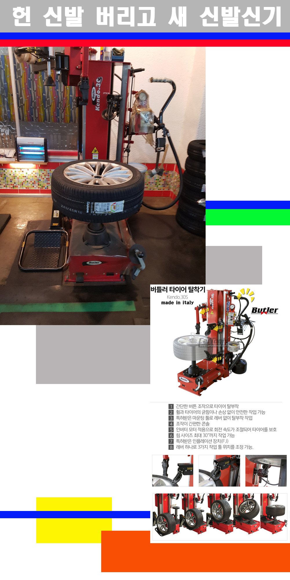 이태리 버틀러사의 켄도3.0S는 휠과 타이어와 조립과 분리시 전혀 제품에 손상을 주지않는 탈착기로 특히 센터락방식(중앙에서 휠를 고정하는 방식)이여서 휠의 중앙부위 잡아서 타이어를 탈부착하고 이후 상하롤러로 타이어를 탈부착합니다 특히 유니포미티작업(휠의 가장가벼운부분과 타이어의 가장 무거운부분을 매칭시키는 작업)시 작업자가 타이어를 정확한 지점에 휠과 매칭시킬수 있는 장점도 있습니다 유니포미티작업 불량시 과도한 진동값으로 핸들링불안 승차감저하 과도한 노면의 충격흡수를 가져와 주행감성을 해치는 첫번째 이유입니다 하지만 이런 작업을 무시하고 그냥 정적인 휠발란스작업만 하는것이 현실입니다 보통 타이어가격만 생각하시고 장착을 하시는데 꼭 이런 부분까지 챙길수 있는 샵을 권장합니다