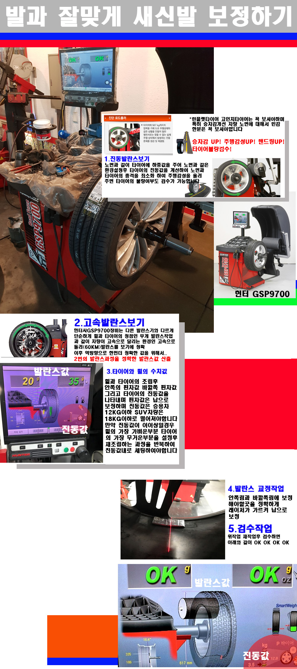 이후 미국 헌터사 GSP9700장비로 고속 및 진동발란스로 더욱더 작업의 정확도와 정밀도를 높였습니다 이장비는 노면에서 올라오는 진동값까지 계산하여 발란스값을 보는 방식으로 진동발란스기는 헌터사GSP9700장비가 유일합니다 이후 역방향으로 60키로의 고속으로 다시 발란스값을 보정하는 방식입니다 그래서 노면에서 올라오는 진동를 잡을수 있으며 특히 타이어의 노면력 측정으로 타이어의 불량여부까지도 검수가 가능한 장비입니다 특히 고속발란스 측정시 타사 발란스기와 틀리게 고속으로 발란스를 보기에 차량이 고속으로 달리는 시뮤레이션 구현이 가능하여 정확한 발란스값을 볼수가 있습니다 그리고 작업자에게는 불필요한 발란스납을 붙이지 않아 미관상으로 좋고 납을 절약하는 고객님에게도윈이고 작업자에게도 윈윈할수 있는 장비입니다 그리고 시중에서 고속진동발란스라고 말하시는 샵들이 많은데 꼭아셔야하는것은 고속발란스는 말그대로 발란스를 볼때 고속으로 돌리기에 60키로 전후 그리고 진동값을 계산하기위해서는 발란스기에 진동롤러가 있어야합니다 그래서 미국헌터사 GSP9700장비가 유일합니다 다른 샵에서 말하는 발란스기는 고속진동발란스기능없는 일반발란스 기기입니다 이점 꼭 아시고 장착하시기를 바랍니다