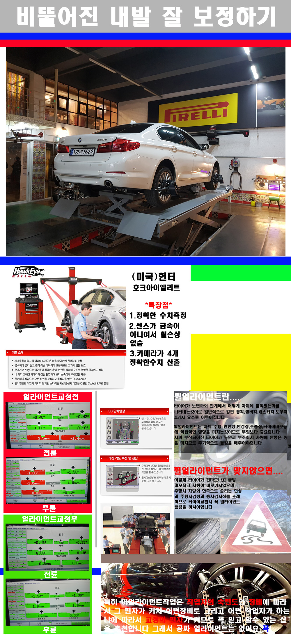 이후 미국 헌터사 호크아이엘리트 장비로 3D얼라이먼트를 진행했습니다 이장비는 현존하는 가장 진화된 얼라이먼트장비입니다 특히 4개의 고성능카메라가 장착되어져 있어 실시간으로 오차가 없는 측정값을 구현하며 바퀴당 각 휠센서 클램프가 프라스틱이며 타이어바닦면을 지지하는 방식이여서 휠의 손상이 없는것이 특징입니다 하지만 장비보다 차량의 얼라이먼트를 볼시 작업자의 정성과 그리고 능력과 숙련도가 관견이기에 꼭 휠얼라이먼트를 장사수단으로 하지않는 샵을 권장합니다 자사는 얼라이먼트정렬시 교정전 교정후를 구분하여 고객님께 직접 이수치값을 확인시켜드리고 작업을 하며 이후 각각의 특성을 가진 타이어들에 대해서 설명 및 관리요령 운전요령 같이 설명해드리고 있습니다 이후 타이어와 휠의 정확한 발란스값과 진동값을 보정후 헌터사 호크아이엘리트 3D얼라이먼트장비로 공장에서 처음 출고될시의 팩토리값으로 교정하였습니다 그리고 타이어질소가스주입기로 3번정도 진공상태로 만든후 질소가스를 주입했습니다 질소가스주입시 가장 관견은 순도이기에 이런 여러번의 진공상태후 주입하고 빼주는 과정를 많이 해주어야합니다 질소가스의 주입시 타이어공기압의 저하가 덜하고 화합물질이 반응을 하지않아 소음전파력과 그리고 타이어안쪽에 수분을 발생하지않으며 타이어안쪽에서의 공기압이 팽창하지않아 타이어에 스트레스를 덜주게 됩니다 하지만 이부분도 공기속에 질소가 80%정도 존재하기에 미미한 차이이지만 질소순도를 높이고 주행시 좋은 점이 확연히 많기에 질소주입을 해드리고 있습니다 특히 고성능타이어나 하중값을 많이 주는 타이어일경우에는 위에서 언급한 부분에서 많이 차이를 보이고 있습니다 이후 타이어왁싱후 출고했습니다+ 감사합니다