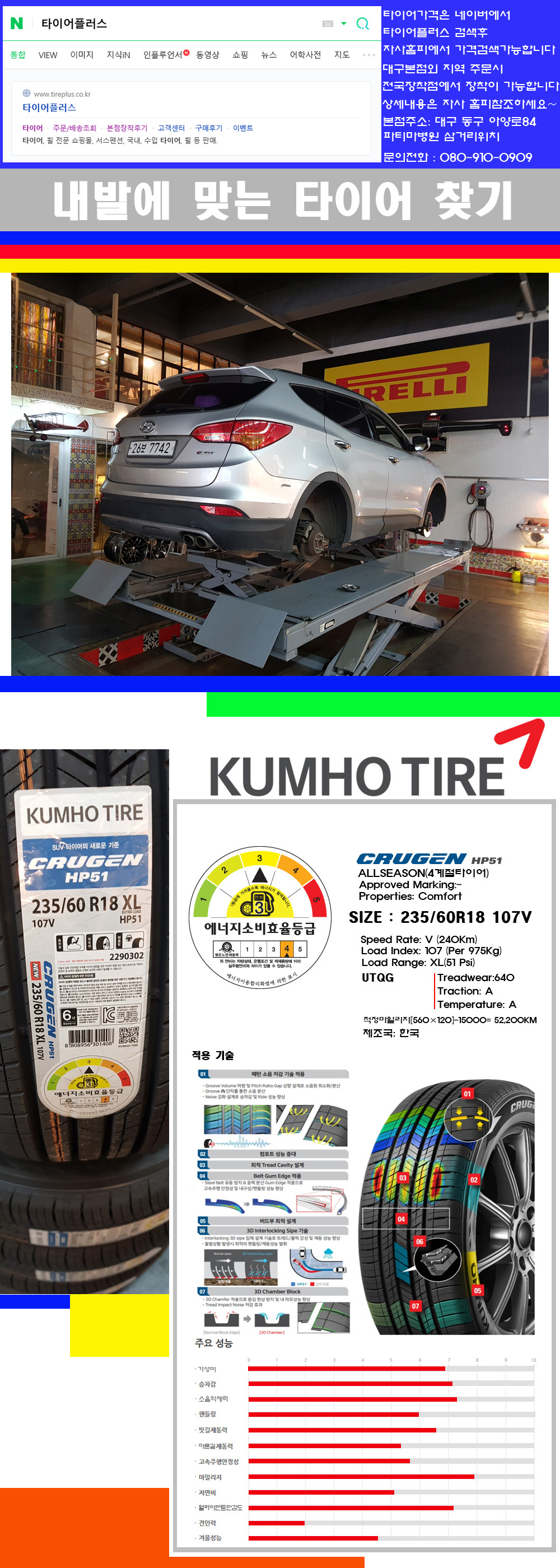 ♥♥♥본점 대구 동구 아양로84 (파티마삼거리 위치) 국산 수입타이어 할인행사중♥♥♥ 타이어플러스 대구본점은 전국에서 가장 규모가 큰매장입니다 물론 자사는 지하층 지상4층건물이며 1층작업장이외는 모두 창고로 사용중인 회사입니다 대구광역시 동구 아양로84(파티마병원 네거리에 위치)그래서 매장으로 바로 오시면 당일에 바로 장착이 가능합니다 물론 한국 금호 넥센 브리지스톤 미쉐린 콘티넨탈 피렐리 던롭 굳이어 요코하마 등 세계유수의 10대 브랜드타이어만 취급하고 있습니다 타이어매장중 단일규모로는 아마 전국에서 제일 커지않을까 생각합니다 가격도 인터넷 최저가로 장착해 드리고 있습니다 고객님들이 오시면서 너무 고급스러워 가격도 비싸지 않을까 생각하시는데 네이버에서 타이어플러스사이트를 검색해보시면 가격 또한 정말 싸게 판매하고 있구나 하고 생각하실것입니다 물론 장비도 현존하는 장비중 가장 최신장비와 그리고 유럽풍 인테리어의 최고급매장입니다 무엇하나 정품만 취급하며 작업또한 꼼꼼하게 매뉴얼에 따라서 작업을 해드립니다 특히 사장님의 이력이 화려한데 자동차경주 레이스와 미캐닉 국제자격증(A)소지자로서 경험한 풍부한 자동차의 지식을 갖춘분이십니다 특히 자동차잡지사에 타이어에 관한 내용도 기재하신 분이며 타이어회사의 타이어테스트드라이브로도 참여한 분이십니다 제품의 품질이나 제품의 성능등을 장사수단으로 말하지 않고 있는 그대로 말해드리며 특히 사장님 성격상 거짓말을 못하는 성격이여서 믿고 맡겨주시면 후회하지 않을 것입니다 그래서 사장님께서 직접상담해주시고 장착도 해주시는 매장이기에 더 신뢰가 가지 않을까 생각합니다 자사는 인터넷 최저가 기반으로 성장한 회사이기에 가격또한 인터넷 최저가로 장착해 드리고 있습니다 그리고 자사는 고객만족도에서 대상까지 수상한 회사입니다 그래서 한번 저의 매장에서 작업하신 고객님은 아마 다른곳에서는 아마 눈에 차지 않을것이라 생각합니다 가격이면 가격 작업의 완성도면 완성도 그리고 사후 관리까지 최고중에 최고가 되기위해서 노력하는 매장입니다 지금까지 어느 매장에서도 느끼지 못한 감성들을 느끼시기를 바랍니다 감사합니다