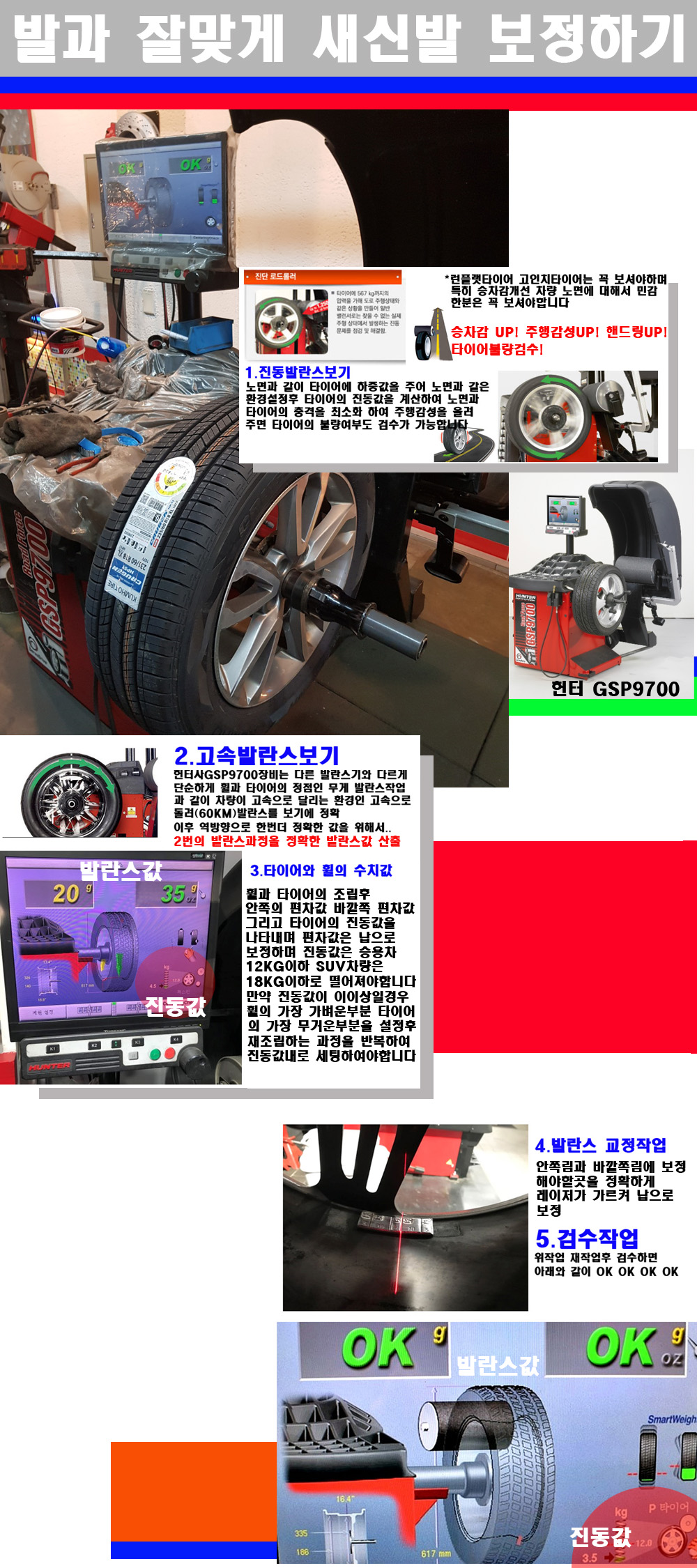 이후 미국 헌터사 GSP9700장비로 고속 및 진동발란스로 더욱더 작업의 정확도와 정밀도를 높였습니다 이장비는 노면에서 올라오는 진동값까지 계산하여 발란스값을 보는 방식으로 진동발란스기는 헌터사GSP9700장비가 유일합니다 이후 역방향으로 60키로의 고속으로 다시 발란스값을 보정하는 방식입니다 그래서 노면에서 올라오는 진동를 잡을수 있으며 특히 타이어의 노면력 측정으로 타이어의 불량여부까지도 검수가 가능한 장비입니다 특히 고속발란스 측정시 타사 발란스기와 틀리게 고속으로 발란스를 보기에 차량이 고속으로 달리는 시뮤레이션 구현이 가능하여 정확한 발란스값을 볼수가 있습니다 그리고 작업자에게는 불필요한 발란스납을 붙이지 않아 미관상으로 좋고 납을 절약하는 고객님에게도윈이고 작업자에게도 윈윈할수 있는 장비입니다 그리고 시중에서 고속진동발란스라고 말하시는 샵들이 많은데 꼭아셔야하는것은 고속발란스는 말그대로 발란스를 볼때 고속으로 돌리기에 60키로 전후 그리고 진동값을 계산하기위해서는 발란스기에 진동롤러가 있어야합니다 그래서 미국헌터사 GSP9700장비가 유일합니다 다른 샵에서 말하는 발란스기는 고속진동발란스기능없는 일반발란스 기기입니다 이점 꼭 아시고 장착하시기를 바랍니다