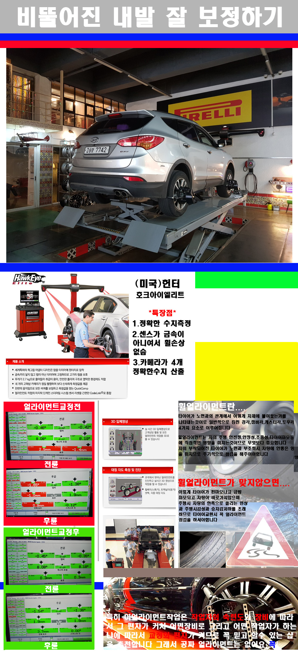 이후 미국 헌터사 호크아이엘리트 장비로 3D얼라이먼트를 진행했습니다 이장비는 현존하는 가장 진화된 얼라이먼트장비입니다 특히 4개의 고성능카메라가 장착되어져 있어 실시간으로 오차가 없는 측정값을 구현하며 바퀴당 각 휠센서 클램프가 프라스틱이며 타이어바닦면을 지지하는 방식이여서 휠의 손상이 없는것이 특징입니다 하지만 장비보다 차량의 얼라이먼트를 볼시 작업자의 정성과 그리고 능력과 숙련도가 관견이기에 꼭 휠얼라이먼트를 장사수단으로 하지않는 샵을 권장합니다 자사는 얼라이먼트정렬시 교정전 교정후를 구분하여 고객님께 직접 이수치값을 확인시켜드리고 작업을 하며 이후 각각의 특성을 가진 타이어들에 대해서 설명 및 관리요령 운전요령 같이 설명해드리고 있습니다 이후 타이어와 휠의 정확한 발란스값과 진동값을 보정후 헌터사 호크아이엘리트 3D얼라이먼트장비로 공장에서 처음 출고될시의 팩토리값으로 교정하였습니다 그리고 타이어질소가스주입기로 3번정도 진공상태로 만든후 질소가스를 주입했습니다 질소가스주입시 가장 관견은 순도이기에 이런 여러번의 진공상태후 주입하고 빼주는 과정를 많이 해주어야합니다 질소가스의 주입시 타이어공기압의 저하가 덜하고 화합물질이 반응을 하지않아 소음전파력과 그리고 타이어안쪽에 수분을 발생하지않으며 타이어안쪽에서의 공기압이 팽창하지않아 타이어에 스트레스를 덜주게 됩니다 하지만 이부분도 공기속에 질소가 80%정도 존재하기에 미미한 차이이지만 질소순도를 높이고 주행시 좋은 점이 확연히 많기에 질소주입을 해드리고 있습니다 특히 고성능타이어나 하중값을 많이 주는 타이어일경우에는 위에서 언급한 부분에서 많이 차이를 보이고 있습니다 이후 타이어왁싱후 출고했습니다+ 감사합니다