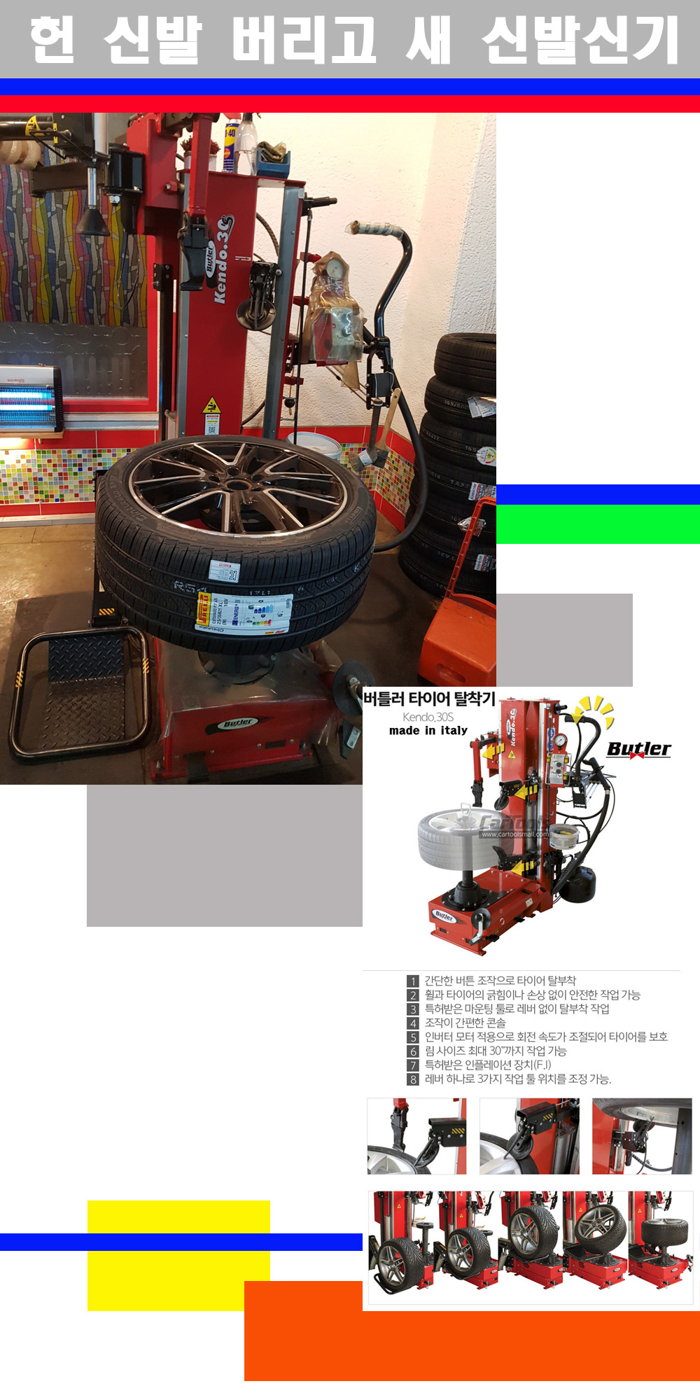 이태리 버틀러사의 켄도3.0S는 휠과 타이어와 조립과 분리시 전혀 제품에 손상을 주지않는 탈착기로 특히 센터락방식(중앙에서 휠를 고정하는 방식)이여서 휠의 중앙부위 잡아서 타이어를 탈부착하고 이후 상하롤러로 타이어를 탈부착합니다 특히 유니포미티작업(휠의 가장가벼운부분과 타이어의 가장 무거운부분을 매칭시키는 작업)시 작업자가 타이어를 정확한 지점에 휠과 매칭시킬수 있는 장점도 있습니다 유니포미티작업 불량시 과도한 진동값으로 핸들링불안 승차감저하 과도한 노면의 충격흡수를 가져와 주행감성을 해치는 첫번째 이유입니다 하지만 이런 작업을 무시하고 그냥 정적인 휠발란스작업만 하는것이 현실입니다 보통 타이어가격만 생각하시고 장착을 하시는데 꼭 이런 부분까지 챙길수 있는 샵을 권장합니다
