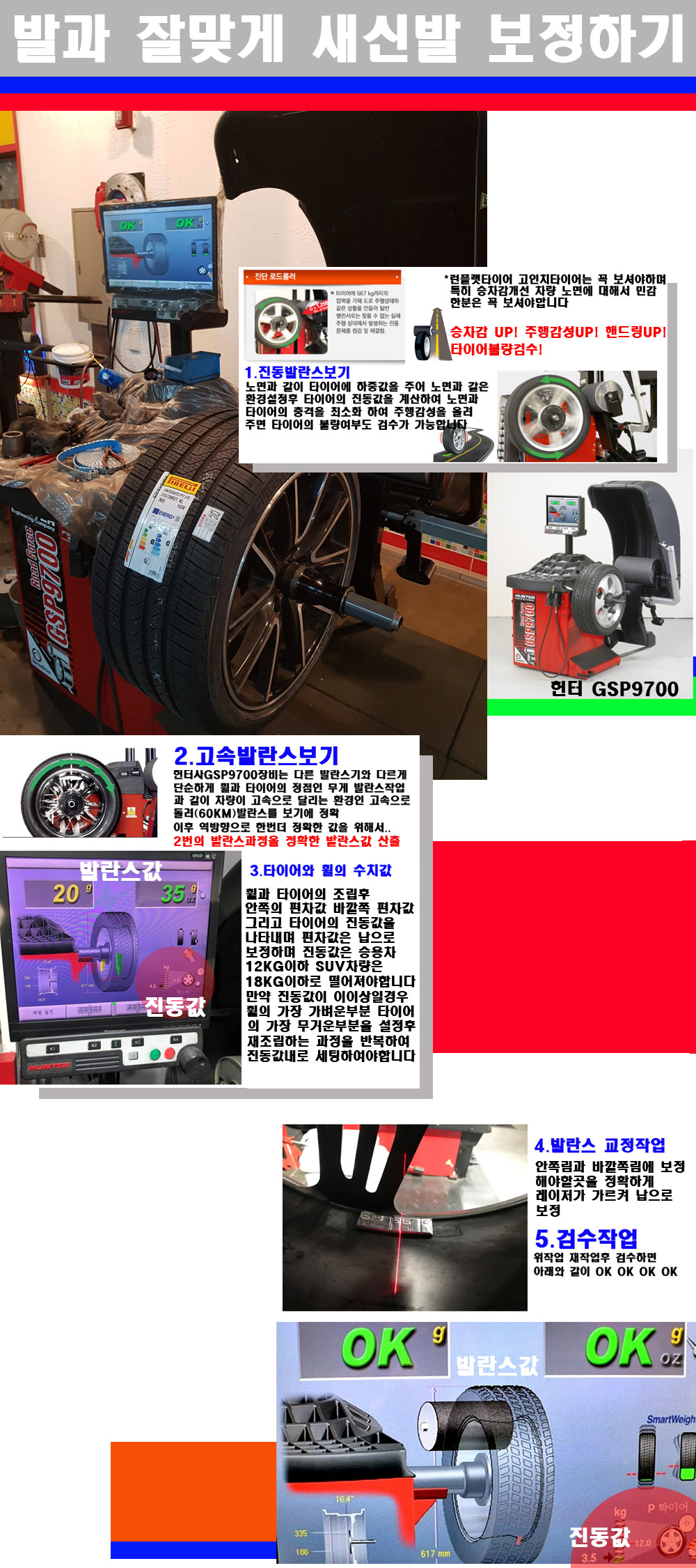 이후 미국 헌터사 GSP9700장비로 고속 및 진동발란스로 더욱더 작업의 정확도와 정밀도를 높였습니다 이장비는 노면에서 올라오는 진동값까지 계산하여 발란스값을 보는 방식으로 진동발란스기는 헌터사GSP9700장비가 유일합니다 이후 역방향으로 60키로의 고속으로 다시 발란스값을 보정하는 방식입니다 그래서 노면에서 올라오는 진동를 잡을수 있으며 특히 타이어의 노면력 측정으로 타이어의 불량여부까지도 검수가 가능한 장비입니다 특히 고속발란스 측정시 타사 발란스기와 틀리게 고속으로 발란스를 보기에 차량이 고속으로 달리는 시뮤레이션 구현이 가능하여 정확한 발란스값을 볼수가 있습니다 그리고 작업자에게는 불필요한 발란스납을 붙이지 않아 미관상으로 좋고 납을 절약하는 고객님에게도윈이고 작업자에게도 윈윈할수 있는 장비입니다 그리고 시중에서 고속진동발란스라고 말하시는 샵들이 많은데 꼭아셔야하는것은 고속발란스는 말그대로 발란스를 볼때 고속으로 돌리기에 60키로 전후 그리고 진동값을 계산하기위해서는 발란스기에 진동롤러가 있어야합니다 그래서 미국헌터사 GSP9700장비가 유일합니다 다른 샵에서 말하는 발란스기는 고속진동발란스기능없는 일반발란스 기기입니다 이점 꼭 아시고 장착하시기를 바랍니다