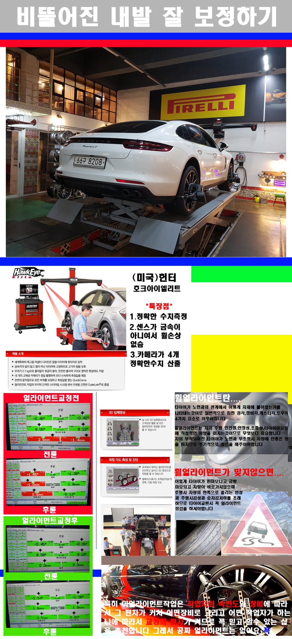 이후 미국 헌터사 호크아이엘리트 장비로 3D얼라이먼트를 진행했습니다 이장비는 현존하는 가장 진화된 얼라이먼트장비입니다 특히 4개의 고성능카메라가 장착되어져 있어 실시간으로 오차가 없는 측정값을 구현하며 바퀴당 각 휠센서 클램프가 프라스틱이며 타이어바닦면을 지지하는 방식이여서 휠의 손상이 없는것이 특징입니다 하지만 장비보다 차량의 얼라이먼트를 볼시 작업자의 정성과 그리고 능력과 숙련도가 관견이기에 꼭 휠얼라이먼트를 장사수단으로 하지않는 샵을 권장합니다 자사는 얼라이먼트정렬시 교정전 교정후를 구분하여 고객님께 직접 이수치값을 확인시켜드리고 작업을 하며 이후 각각의 특성을 가진 타이어들에 대해서 설명 및 관리요령 운전요령 같이 설명해드리고 있습니다 이후 타이어와 휠의 정확한 발란스값과 진동값을 보정후 헌터사 호크아이엘리트 3D얼라이먼트장비로 공장에서 처음 출고될시의 팩토리값으로 교정하였습니다 그리고 타이어질소가스주입기로 3번정도 진공상태로 만든후 질소가스를 주입했습니다 질소가스주입시 가장 관견은 순도이기에 이런 여러번의 진공상태후 주입하고 빼주는 과정를 많이 해주어야합니다 질소가스의 주입시 타이어공기압의 저하가 덜하고 화합물질이 반응을 하지않아 소음전파력과 그리고 타이어안쪽에 수분을 발생하지않으며 타이어안쪽에서의 공기압이 팽창하지않아 타이어에 스트레스를 덜주게 됩니다 하지만 이부분도 공기속에 질소가 80%정도 존재하기에 미미한 차이이지만 질소순도를 높이고 주행시 좋은 점이 확연히 많기에 질소주입을 해드리고 있습니다 특히 고성능타이어나 하중값을 많이 주는 타이어일경우에는 위에서 언급한 부분에서 많이 차이를 보이고 있습니다 이후 타이어왁싱후 출고했습니다+ 감사합니다