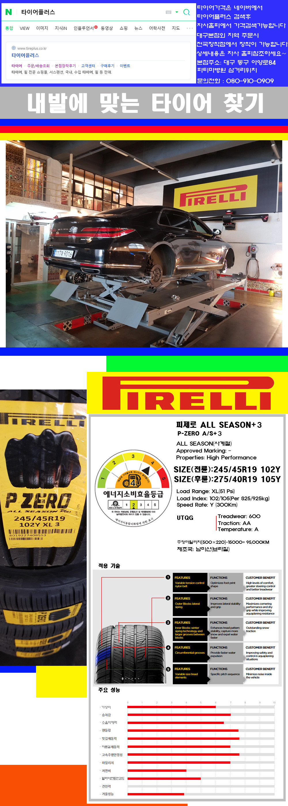 ♥♥♥본점 대구 동구 아양로84 (파티마삼거리 위치) 국산 수입타이어 할인행사중♥♥♥ 타이어플러스 대구본점은 전국에서 가장 규모가 큰매장입니다 물론 자사는 지하층 지상4층건물이며 1층작업장이외는 모두 창고로 사용중인 회사입니다 대구광역시 동구 아양로84(파티마병원 네거리에 위치)그래서 매장으로 바로 오시면 당일에 바로 장착이 가능합니다 물론 한국 금호 넥센 브리지스톤 미쉐린 콘티넨탈 피렐리 던롭 굳이어 요코하마 등 세계유수의 10대 브랜드타이어만 취급하고 있습니다 타이어매장중 단일규모로는 아마 전국에서 제일 커지않을까 생각합니다 가격도 인터넷 최저가로 장착해 드리고 있습니다 고객님들이 오시면서 너무 고급스러워 가격도 비싸지 않을까 생각하시는데 네이버에서 타이어플러스사이트를 검색해보시면 가격 또한 정말 싸게 판매하고 있구나 하고 생각하실것입니다 물론 장비도 현존하는 장비중 가장 최신장비와 그리고 유럽풍 인테리어의 최고급매장입니다 무엇하나 정품만 취급하며 작업또한 꼼꼼하게 매뉴얼에 따라서 작업을 해드립니다 특히 사장님의 이력이 화려한데 자동차경주 레이스와 미캐닉 국제자격증(A)소지자로서 경험한 풍부한 자동차의 지식을 갖춘분이십니다 특히 자동차잡지사에 타이어에 관한 내용도 기재하신 분이며 타이어회사의 타이어테스트드라이브로도 참여한 분이십니다 제품의 품질이나 제품의 성능등을 장사수단으로 말하지 않고 있는 그대로 말해드리며 특히 사장님 성격상 거짓말을 못하는 성격이여서 믿고 맡겨주시면 후회하지 않을 것입니다 그래서 사장님께서 직접상담해주시고 장착도 해주시는 매장이기에 더 신뢰가 가지 않을까 생각합니다 자사는 인터넷 최저가 기반으로 성장한 회사이기에 가격또한 인터넷 최저가로 장착해 드리고 있습니다 그리고 자사는 고객만족도에서 대상까지 수상한 회사입니다 그래서 한번 저의 매장에서 작업하신 고객님은 아마 다른곳에서는 아마 눈에 차지 않을것이라 생각합니다 가격이면 가격 작업의 완성도면 완성도 그리고 사후 관리까지 최고중에 최고가 되기위해서 노력하는 매장입니다 지금까지 어느 매장에서도 느끼지 못한 감성들을 느끼시기를 바랍니다 감사합니다