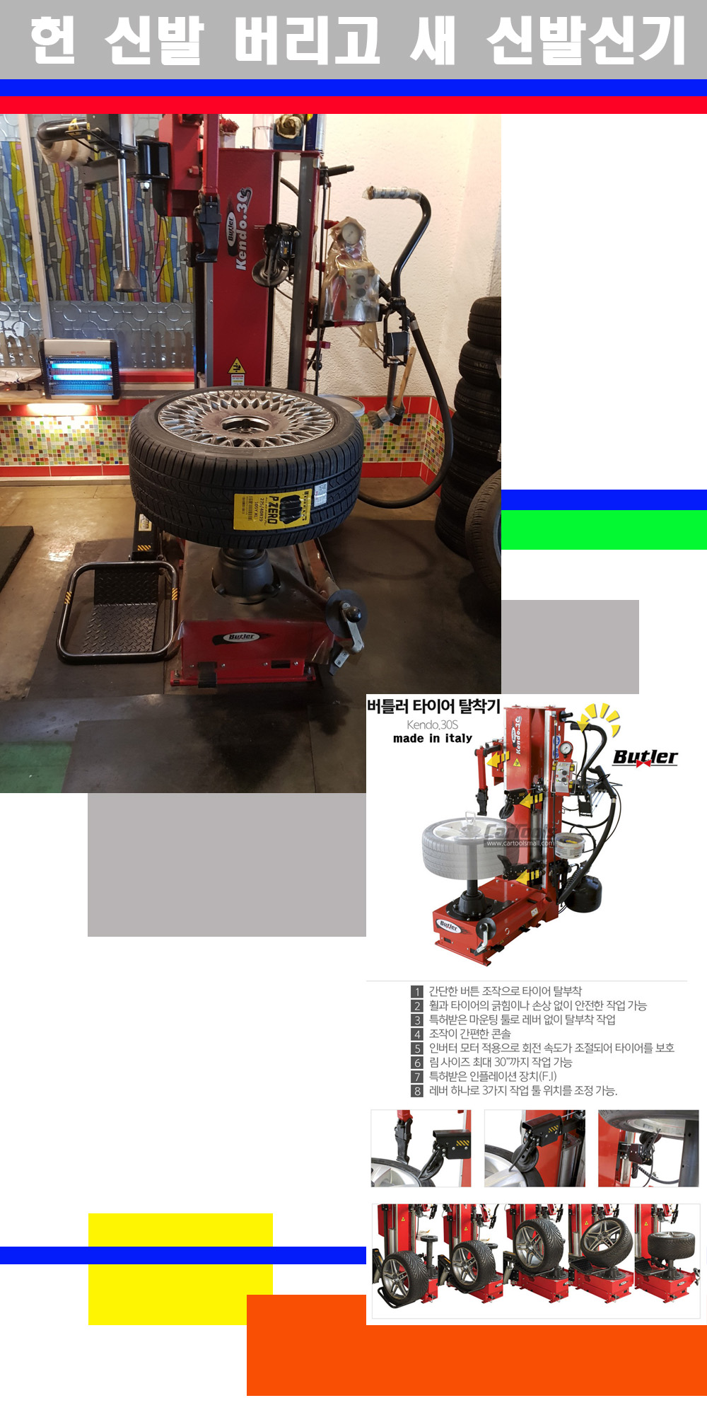 이태리 버틀러사의 켄도3.0S는 휠과 타이어와 조립과 분리시 전혀 제품에 손상을 주지않는 탈착기로 특히 센터락방식(중앙에서 휠를 고정하는 방식)이여서 휠의 중앙부위 잡아서 타이어를 탈부착하고 이후 상하롤러로 타이어를 탈부착합니다 특히 유니포미티작업(휠의 가장가벼운부분과 타이어의 가장 무거운부분을 매칭시키는 작업)시 작업자가 타이어를 정확한 지점에 휠과 매칭시킬수 있는 장점도 있습니다 유니포미티작업 불량시 과도한 진동값으로 핸들링불안 승차감저하 과도한 노면의 충격흡수를 가져와 주행감성을 해치는 첫번째 이유입니다 하지만 이런 작업을 무시하고 그냥 정적인 휠발란스작업만 하는것이 현실입니다 보통 타이어가격만 생각하시고 장착을 하시는데 꼭 이런 부분까지 챙길수 있는 샵을 권장합니다