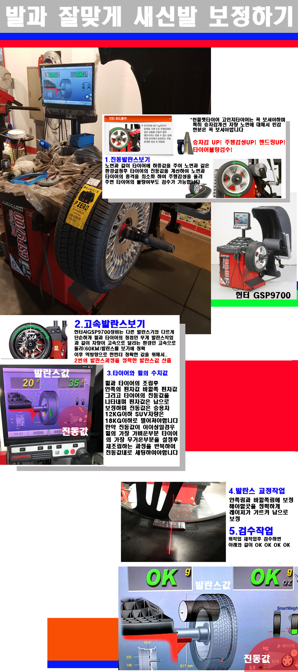이후 미국 헌터사 GSP9700장비로 고속 및 진동발란스로 더욱더 작업의 정확도와 정밀도를 높였습니다 이장비는 노면에서 올라오는 진동값까지 계산하여 발란스값을 보는 방식으로 진동발란스기는 헌터사GSP9700장비가 유일합니다 이후 역방향으로 60키로의 고속으로 다시 발란스값을 보정하는 방식입니다 그래서 노면에서 올라오는 진동를 잡을수 있으며 특히 타이어의 노면력 측정으로 타이어의 불량여부까지도 검수가 가능한 장비입니다 특히 고속발란스 측정시 타사 발란스기와 틀리게 고속으로 발란스를 보기에 차량이 고속으로 달리는 시뮤레이션 구현이 가능하여 정확한 발란스값을 볼수가 있습니다 그리고 작업자에게는 불필요한 발란스납을 붙이지 않아 미관상으로 좋고 납을 절약하는 고객님에게도윈이고 작업자에게도 윈윈할수 있는 장비입니다 그리고 시중에서 고속진동발란스라고 말하시는 샵들이 많은데 꼭아셔야하는것은 고속발란스는 말그대로 발란스를 볼때 고속으로 돌리기에 60키로 전후 그리고 진동값을 계산하기위해서는 발란스기에 진동롤러가 있어야합니다 그래서 미국헌터사 GSP9700장비가 유일합니다 다른 샵에서 말하는 발란스기는 고속진동발란스기능없는 일반발란스 기기입니다 이점 꼭 아시고 장착하시기를 바랍니다