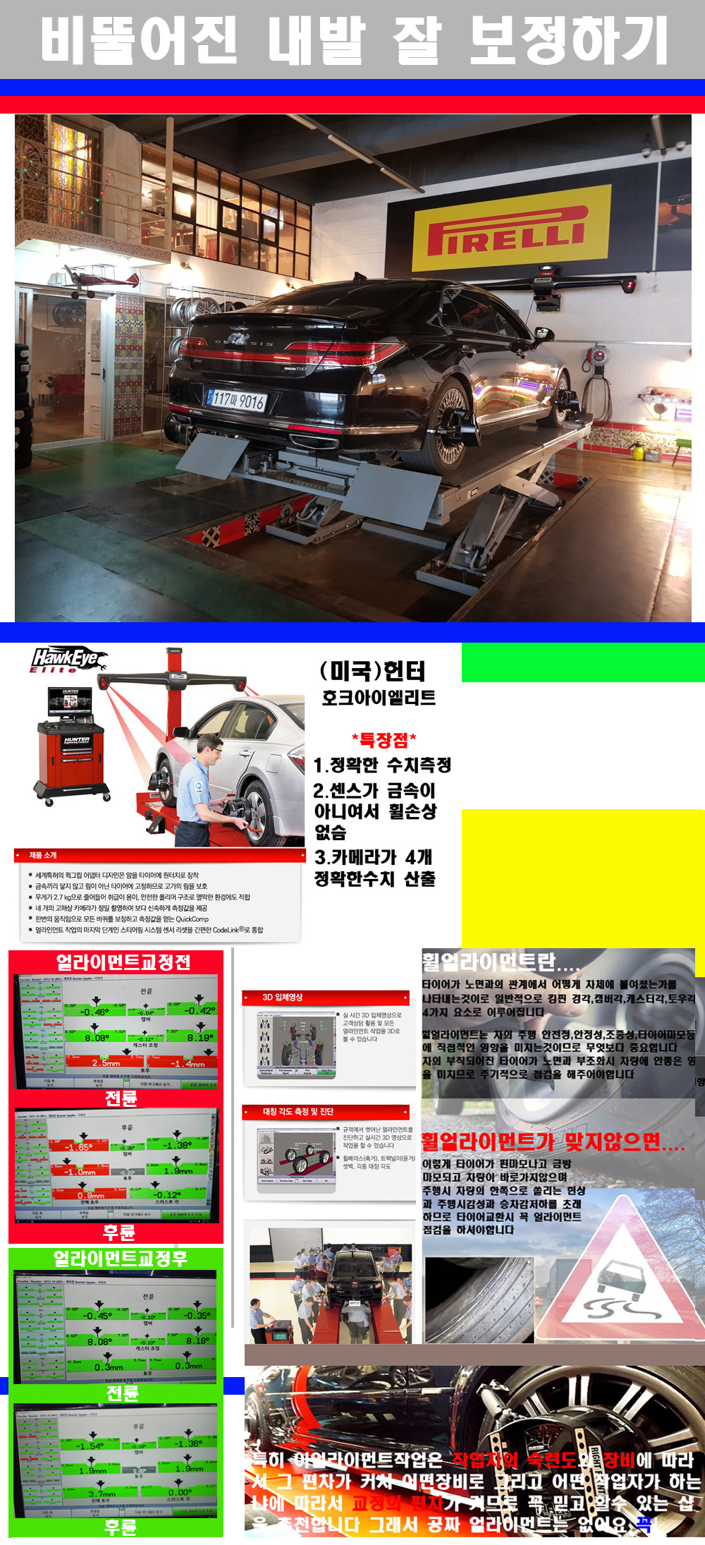 이후 미국 헌터사 호크아이엘리트 장비로 3D얼라이먼트를 진행했습니다 이장비는 현존하는 가장 진화된 얼라이먼트장비입니다 특히 4개의 고성능카메라가 장착되어져 있어 실시간으로 오차가 없는 측정값을 구현하며 바퀴당 각 휠센서 클램프가 프라스틱이며 타이어바닦면을 지지하는 방식이여서 휠의 손상이 없는것이 특징입니다 하지만 장비보다 차량의 얼라이먼트를 볼시 작업자의 정성과 그리고 능력과 숙련도가 관견이기에 꼭 휠얼라이먼트를 장사수단으로 하지않는 샵을 권장합니다 자사는 얼라이먼트정렬시 교정전 교정후를 구분하여 고객님께 직접 이수치값을 확인시켜드리고 작업을 하며 이후 각각의 특성을 가진 타이어들에 대해서 설명 및 관리요령 운전요령 같이 설명해드리고 있습니다 이후 타이어와 휠의 정확한 발란스값과 진동값을 보정후 헌터사 호크아이엘리트 3D얼라이먼트장비로 공장에서 처음 출고될시의 팩토리값으로 교정하였습니다 그리고 타이어질소가스주입기로 3번정도 진공상태로 만든후 질소가스를 주입했습니다 질소가스주입시 가장 관견은 순도이기에 이런 여러번의 진공상태후 주입하고 빼주는 과정를 많이 해주어야합니다 질소가스의 주입시 타이어공기압의 저하가 덜하고 화합물질이 반응을 하지않아 소음전파력과 그리고 타이어안쪽에 수분을 발생하지않으며 타이어안쪽에서의 공기압이 팽창하지않아 타이어에 스트레스를 덜주게 됩니다 하지만 이부분도 공기속에 질소가 80%정도 존재하기에 미미한 차이이지만 질소순도를 높이고 주행시 좋은 점이 확연히 많기에 질소주입을 해드리고 있습니다 특히 고성능타이어나 하중값을 많이 주는 타이어일경우에는 위에서 언급한 부분에서 많이 차이를 보이고 있습니다 이후 타이어왁싱후 출고했습니다+ 감사합니다