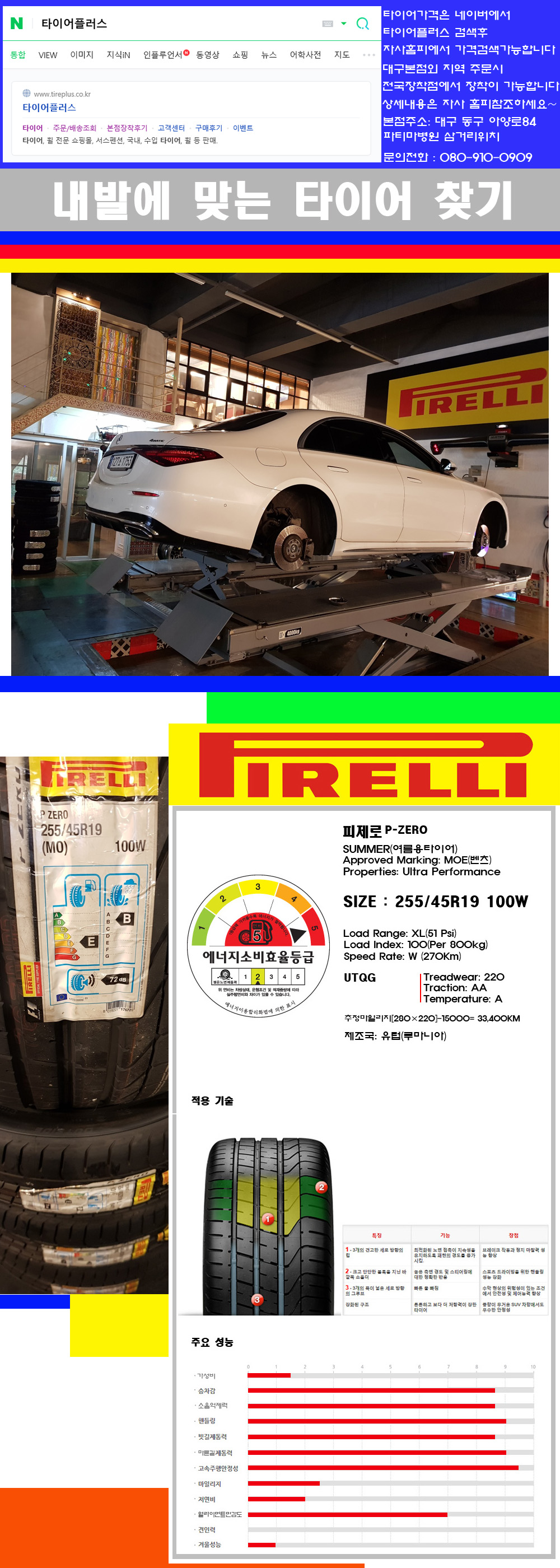♥♥♥본점 대구 동구 아양로84 (파티마삼거리 위치) 국산 수입타이어 할인행사중♥♥♥ 타이어플러스 대구본점은 전국에서 가장 규모가 큰매장입니다 물론 자사는 지하층 지상4층건물이며 1층작업장이외는 모두 창고로 사용중인 회사입니다 대구광역시 동구 아양로84(파티마병원 네거리에 위치)그래서 매장으로 바로 오시면 당일에 바로 장착이 가능합니다 물론 한국 금호 넥센 브리지스톤 미쉐린 콘티넨탈 피렐리 던롭 굳이어 요코하마 등 세계유수의 10대 브랜드타이어만 취급하고 있습니다 타이어매장중 단일규모로는 아마 전국에서 제일 커지않을까 생각합니다 가격도 인터넷 최저가로 장착해 드리고 있습니다 고객님들이 오시면서 너무 고급스러워 가격도 비싸지 않을까 생각하시는데 네이버에서 타이어플러스사이트를 검색해보시면 가격 또한 정말 싸게 판매하고 있구나 하고 생각하실것입니다 물론 장비도 현존하는 장비중 가장 최신장비와 그리고 유럽풍 인테리어의 최고급매장입니다 무엇하나 정품만 취급하며 작업또한 꼼꼼하게 매뉴얼에 따라서 작업을 해드립니다 특히 사장님의 이력이 화려한데 자동차경주 레이스와 미캐닉 국제자격증(A)소지자로서 경험한 풍부한 자동차의 지식을 갖춘분이십니다 특히 자동차잡지사에 타이어에 관한 내용도 기재하신 분이며 타이어회사의 타이어테스트드라이브로도 참여한 분이십니다 제품의 품질이나 제품의 성능등을 장사수단으로 말하지 않고 있는 그대로 말해드리며 특히 사장님 성격상 거짓말을 못하는 성격이여서 믿고 맡겨주시면 후회하지 않을 것입니다 그래서 사장님께서 직접상담해주시고 장착도 해주시는 매장이기에 더 신뢰가 가지 않을까 생각합니다 자사는 인터넷 최저가 기반으로 성장한 회사이기에 가격또한 인터넷 최저가로 장착해 드리고 있습니다 그리고 자사는 고객만족도에서 대상까지 수상한 회사입니다 그래서 한번 저의 매장에서 작업하신 고객님은 아마 다른곳에서는 아마 눈에 차지 않을것이라 생각합니다 가격이면 가격 작업의 완성도면 완성도 그리고 사후 관리까지 최고중에 최고가 되기위해서 노력하는 매장입니다 지금까지 어느 매장에서도 느끼지 못한 감성들을 느끼시기를 바랍니다 감사합니다