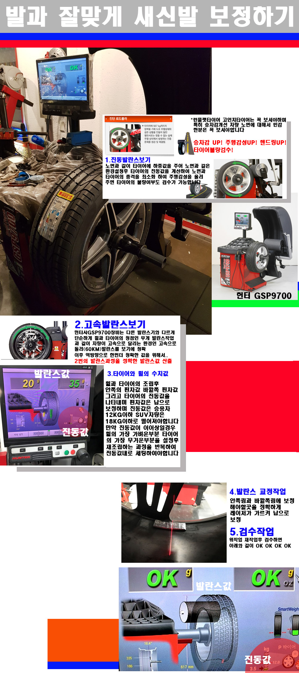 이후 미국 헌터사 GSP9700장비로 고속 및 진동발란스로 더욱더 작업의 정확도와 정밀도를 높였습니다 이장비는 노면에서 올라오는 진동값까지 계산하여 발란스값을 보는 방식으로 진동발란스기는 헌터사GSP9700장비가 유일합니다 이후 역방향으로 60키로의 고속으로 다시 발란스값을 보정하는 방식입니다 그래서 노면에서 올라오는 진동를 잡을수 있으며 특히 타이어의 노면력 측정으로 타이어의 불량여부까지도 검수가 가능한 장비입니다 특히 고속발란스 측정시 타사 발란스기와 틀리게 고속으로 발란스를 보기에 차량이 고속으로 달리는 시뮤레이션 구현이 가능하여 정확한 발란스값을 볼수가 있습니다 그리고 작업자에게는 불필요한 발란스납을 붙이지 않아 미관상으로 좋고 납을 절약하는 고객님에게도윈이고 작업자에게도 윈윈할수 있는 장비입니다 그리고 시중에서 고속진동발란스라고 말하시는 샵들이 많은데 꼭아셔야하는것은 고속발란스는 말그대로 발란스를 볼때 고속으로 돌리기에 60키로 전후 그리고 진동값을 계산하기위해서는 발란스기에 진동롤러가 있어야합니다 그래서 미국헌터사 GSP9700장비가 유일합니다 다른 샵에서 말하는 발란스기는 고속진동발란스기능없는 일반발란스 기기입니다 이점 꼭 아시고 장착하시기를 바랍니다