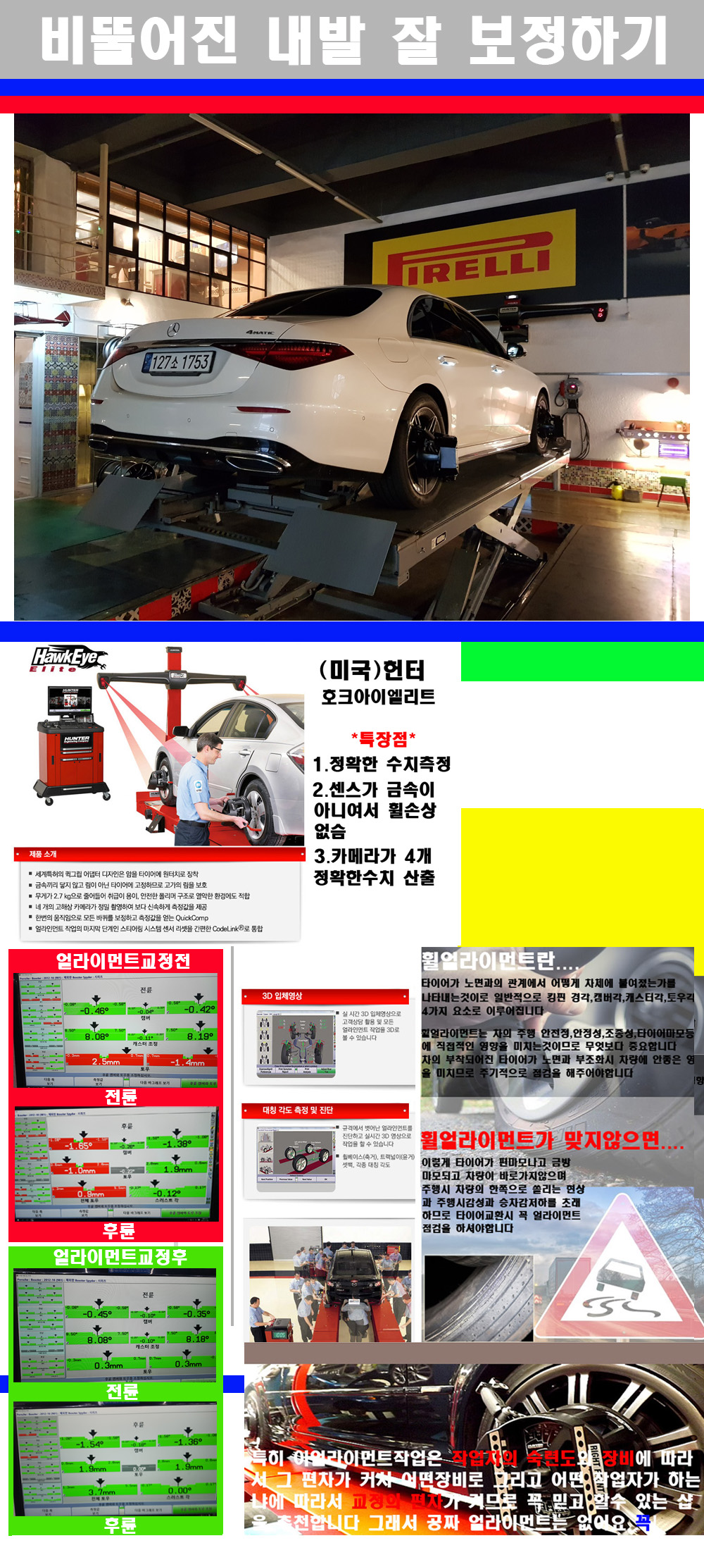 이후 미국 헌터사 호크아이엘리트 장비로 3D얼라이먼트를 진행했습니다 이장비는 현존하는 가장 진화된 얼라이먼트장비입니다 특히 4개의 고성능카메라가 장착되어져 있어 실시간으로 오차가 없는 측정값을 구현하며 바퀴당 각 휠센서 클램프가 프라스틱이며 타이어바닦면을 지지하는 방식이여서 휠의 손상이 없는것이 특징입니다 하지만 장비보다 차량의 얼라이먼트를 볼시 작업자의 정성과 그리고 능력과 숙련도가 관견이기에 꼭 휠얼라이먼트를 장사수단으로 하지않는 샵을 권장합니다 자사는 얼라이먼트정렬시 교정전 교정후를 구분하여 고객님께 직접 이수치값을 확인시켜드리고 작업을 하며 이후 각각의 특성을 가진 타이어들에 대해서 설명 및 관리요령 운전요령 같이 설명해드리고 있습니다 이후 타이어와 휠의 정확한 발란스값과 진동값을 보정후 헌터사 호크아이엘리트 3D얼라이먼트장비로 공장에서 처음 출고될시의 팩토리값으로 교정하였습니다 그리고 타이어질소가스주입기로 3번정도 진공상태로 만든후 질소가스를 주입했습니다 질소가스주입시 가장 관견은 순도이기에 이런 여러번의 진공상태후 주입하고 빼주는 과정를 많이 해주어야합니다 질소가스의 주입시 타이어공기압의 저하가 덜하고 화합물질이 반응을 하지않아 소음전파력과 그리고 타이어안쪽에 수분을 발생하지않으며 타이어안쪽에서의 공기압이 팽창하지않아 타이어에 스트레스를 덜주게 됩니다 하지만 이부분도 공기속에 질소가 80%정도 존재하기에 미미한 차이이지만 질소순도를 높이고 주행시 좋은 점이 확연히 많기에 질소주입을 해드리고 있습니다 특히 고성능타이어나 하중값을 많이 주는 타이어일경우에는 위에서 언급한 부분에서 많이 차이를 보이고 있습니다 이후 타이어왁싱후 출고했습니다+
