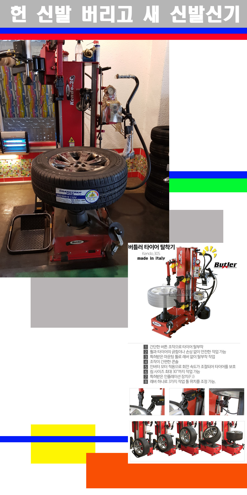 이태리 버틀러사의 켄도3.0S는 휠과 타이어와 조립과 분리시 전혀 제품에 손상을 주지않는 탈착기로 특히 센터락방식(중앙에서 휠를 고정하는 방식)이여서 휠의 중앙부위 잡아서 타이어를 탈부착하고 이후 상하롤러로 타이어를 탈부착합니다 특히 유니포미티작업(휠의 가장가벼운부분과 타이어의 가장 무거운부분을 매칭시키는 작업)시 작업자가 타이어를 정확한 지점에 휠과 매칭시킬수 있는 장점도 있습니다 유니포미티작업 불량시 과도한 진동값으로 핸들링불안 승차감저하 과도한 노면의 충격흡수를 가져와 주행감성을 해치는 첫번째 이유입니다 하지만 이런 작업을 무시하고 그냥 정적인 휠발란스작업만 하는것이 현실입니다 보통 타이어가격만 생각하시고 장착을 하시는데 꼭 이런 부분까지 챙길수 있는 샵을 권장합니다