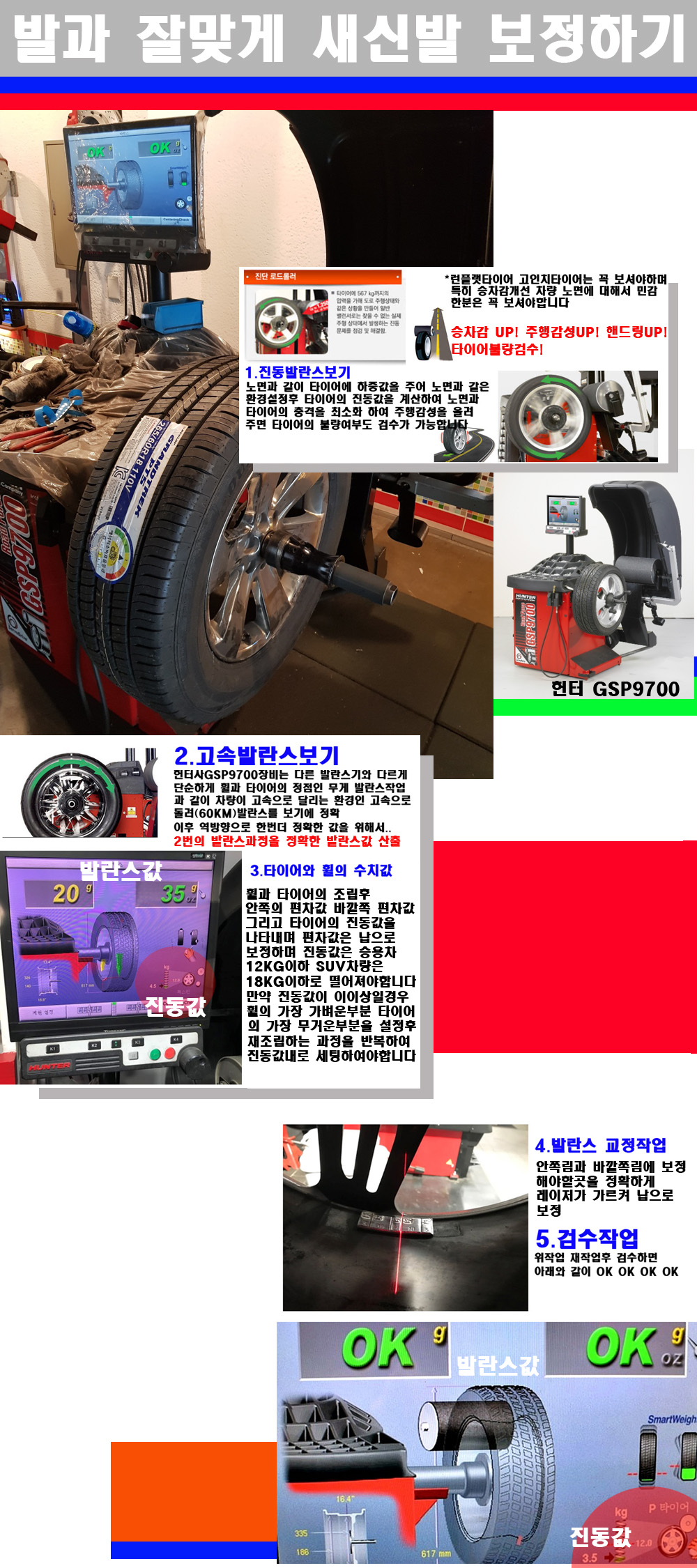 이후 미국 헌터사 GSP9700장비로 고속 및 진동발란스로 더욱더 작업의 정확도와 정밀도를 높였습니다 이장비는 노면에서 올라오는 진동값까지 계산하여 발란스값을 보는 방식으로 진동발란스기는 헌터사GSP9700장비가 유일합니다 이후 역방향으로 60키로의 고속으로 다시 발란스값을 보정하는 방식입니다 그래서 노면에서 올라오는 진동를 잡을수 있으며 특히 타이어의 노면력 측정으로 타이어의 불량여부까지도 검수가 가능한 장비입니다 특히 고속발란스 측정시 타사 발란스기와 틀리게 고속으로 발란스를 보기에 차량이 고속으로 달리는 시뮤레이션 구현이 가능하여 정확한 발란스값을 볼수가 있습니다 그리고 작업자에게는 불필요한 발란스납을 붙이지 않아 미관상으로 좋고 납을 절약하는 고객님에게도윈이고 작업자에게도 윈윈할수 있는 장비입니다 그리고 시중에서 고속진동발란스라고 말하시는 샵들이 많은데 꼭아셔야하는것은 고속발란스는 말그대로 발란스를 볼때 고속으로 돌리기에 60키로 전후 그리고 진동값을 계산하기위해서는 발란스기에 진동롤러가 있어야합니다 그래서 미국헌터사 GSP9700장비가 유일합니다 다른 샵에서 말하는 발란스기는 고속진동발란스기능없는 일반발란스 기기입니다 이점 꼭 아시고 장착하시기를 바랍니다