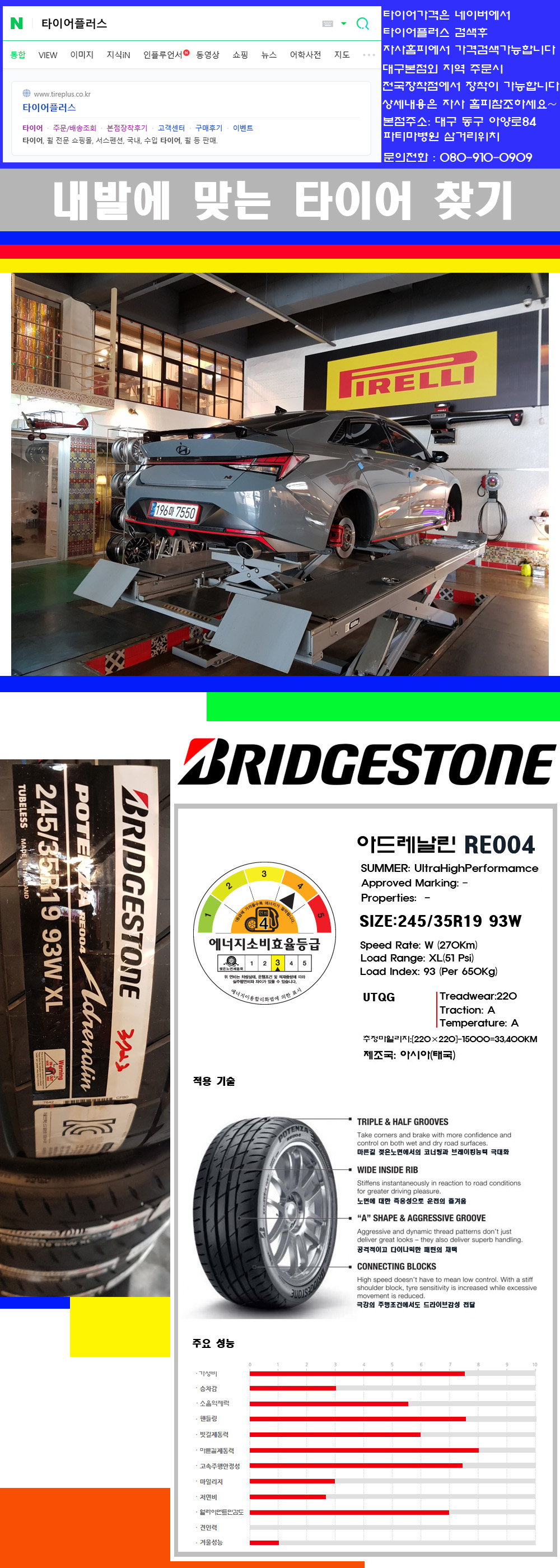 [2453519]아반테 브리지스톤 아드레날린 RE004 245/35R19 |