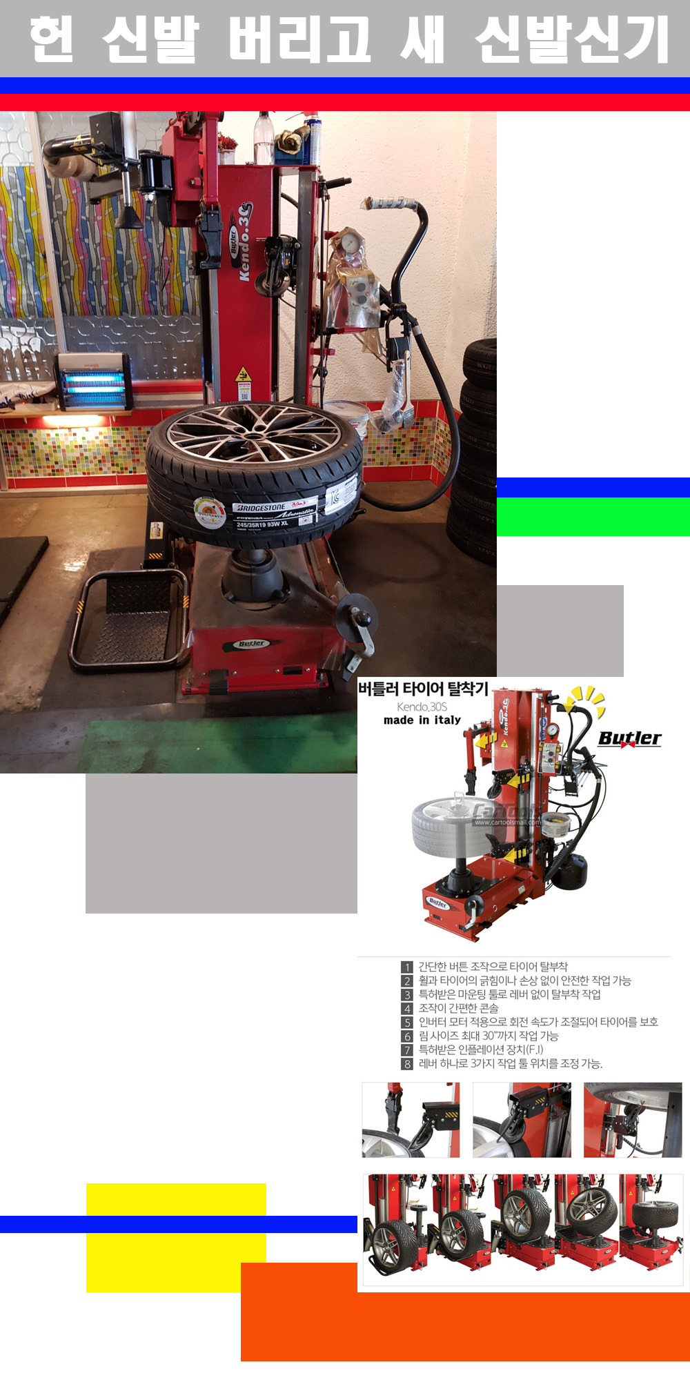 이태리 버틀러사의 켄도3.0S는 휠과 타이어와 조립과 분리시 전혀 제품에 손상을 주지않는 탈착기로 특히 센터락방식(중앙에서 휠를 고정하는 방식)이여서 휠의 중앙부위 잡아서 타이어를 탈부착하고 이후 상하롤러로 타이어를 탈부착합니다 특히 유니포미티작업(휠의 가장가벼운부분과 타이어의 가장 무거운부분을 매칭시키는 작업)시 작업자가 타이어를 정확한 지점에 휠과 매칭시킬수 있는 장점도 있습니다 유니포미티작업 불량시 과도한 진동값으로 핸들링불안 승차감저하 과도한 노면의 충격흡수를 가져와 주행감성을 해치는 첫번째 이유입니다 하지만 이런 작업을 무시하고 그냥 정적인 휠발란스작업만 하는것이 현실입니다 보통 타이어가격만 생각하시고 장착을 하시는데 꼭 이런 부분까지 챙길수 있는 샵을 권장합니다