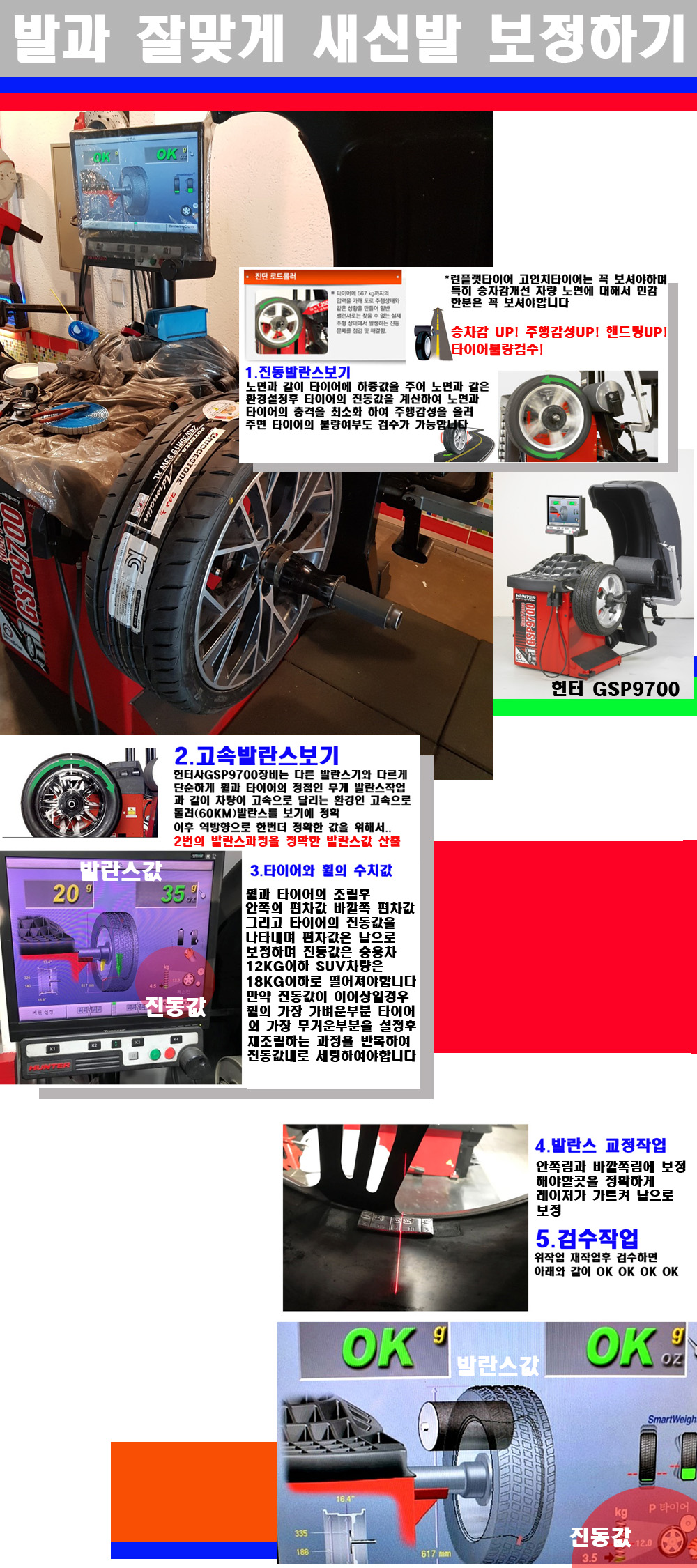 이후 미국 헌터사 GSP9700장비로 고속 및 진동발란스로 더욱더 작업의 정확도와 정밀도를 높였습니다 이장비는 노면에서 올라오는 진동값까지 계산하여 발란스값을 보는 방식으로 진동발란스기는 헌터사GSP9700장비가 유일합니다 이후 역방향으로 60키로의 고속으로 다시 발란스값을 보정하는 방식입니다 그래서 노면에서 올라오는 진동를 잡을수 있으며 특히 타이어의 노면력 측정으로 타이어의 불량여부까지도 검수가 가능한 장비입니다 특히 고속발란스 측정시 타사 발란스기와 틀리게 고속으로 발란스를 보기에 차량이 고속으로 달리는 시뮤레이션 구현이 가능하여 정확한 발란스값을 볼수가 있습니다 그리고 작업자에게는 불필요한 발란스납을 붙이지 않아 미관상으로 좋고 납을 절약하는 고객님에게도윈이고 작업자에게도 윈윈할수 있는 장비입니다 그리고 시중에서 고속진동발란스라고 말하시는 샵들이 많은데 꼭아셔야하는것은 고속발란스는 말그대로 발란스를 볼때 고속으로 돌리기에 60키로 전후 그리고 진동값을 계산하기위해서는 발란스기에 진동롤러가 있어야합니다 그래서 미국헌터사 GSP9700장비가 유일합니다 다른 샵에서 말하는 발란스기는 고속진동발란스기능없는 일반발란스 기기입니다 이점 꼭 아시고 장착하시기를 바랍니다