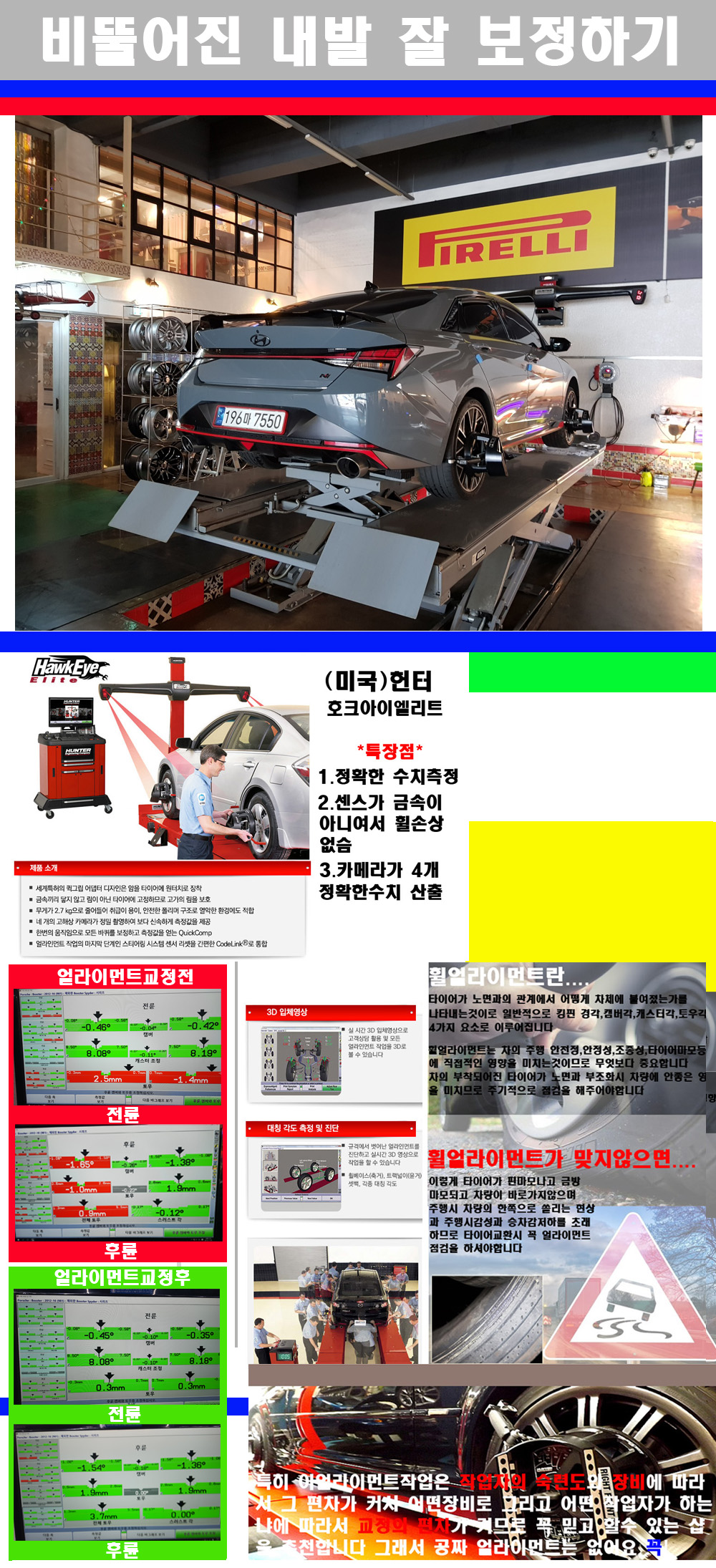 이후 미국 헌터사 호크아이엘리트 장비로 3D얼라이먼트를 진행했습니다 이장비는 현존하는 가장 진화된 얼라이먼트장비입니다 특히 4개의 고성능카메라가 장착되어져 있어 실시간으로 오차가 없는 측정값을 구현하며 바퀴당 각 휠센서 클램프가 프라스틱이며 타이어바닦면을 지지하는 방식이여서 휠의 손상이 없는것이 특징입니다 하지만 장비보다 차량의 얼라이먼트를 볼시 작업자의 정성과 그리고 능력과 숙련도가 관견이기에 꼭 휠얼라이먼트를 장사수단으로 하지않는 샵을 권장합니다 자사는 얼라이먼트정렬시 교정전 교정후를 구분하여 고객님께 직접 이수치값을 확인시켜드리고 작업을 하며 이후 각각의 특성을 가진 타이어들에 대해서 설명 및 관리요령 운전요령 같이 설명해드리고 있습니다 이후 타이어와 휠의 정확한 발란스값과 진동값을 보정후 헌터사 호크아이엘리트 3D얼라이먼트장비로 공장에서 처음 출고될시의 팩토리값으로 교정하였습니다 그리고 타이어질소가스주입기로 3번정도 진공상태로 만든후 질소가스를 주입했습니다 질소가스주입시 가장 관견은 순도이기에 이런 여러번의 진공상태후 주입하고 빼주는 과정를 많이 해주어야합니다 질소가스의 주입시 타이어공기압의 저하가 덜하고 화합물질이 반응을 하지않아 소음전파력과 그리고 타이어안쪽에 수분을 발생하지않으며 타이어안쪽에서의 공기압이 팽창하지않아 타이어에 스트레스를 덜주게 됩니다 하지만 이부분도 공기속에 질소가 80%정도 존재하기에 미미한 차이이지만 질소순도를 높이고 주행시 좋은 점이 확연히 많기에 질소주입을 해드리고 있습니다 특히 고성능타이어나 하중값을 많이 주는 타이어일경우에는 위에서 언급한 부분에서 많이 차이를 보이고 있습니다 이후 타이어왁싱후 출고했습니다+ 감사합니다