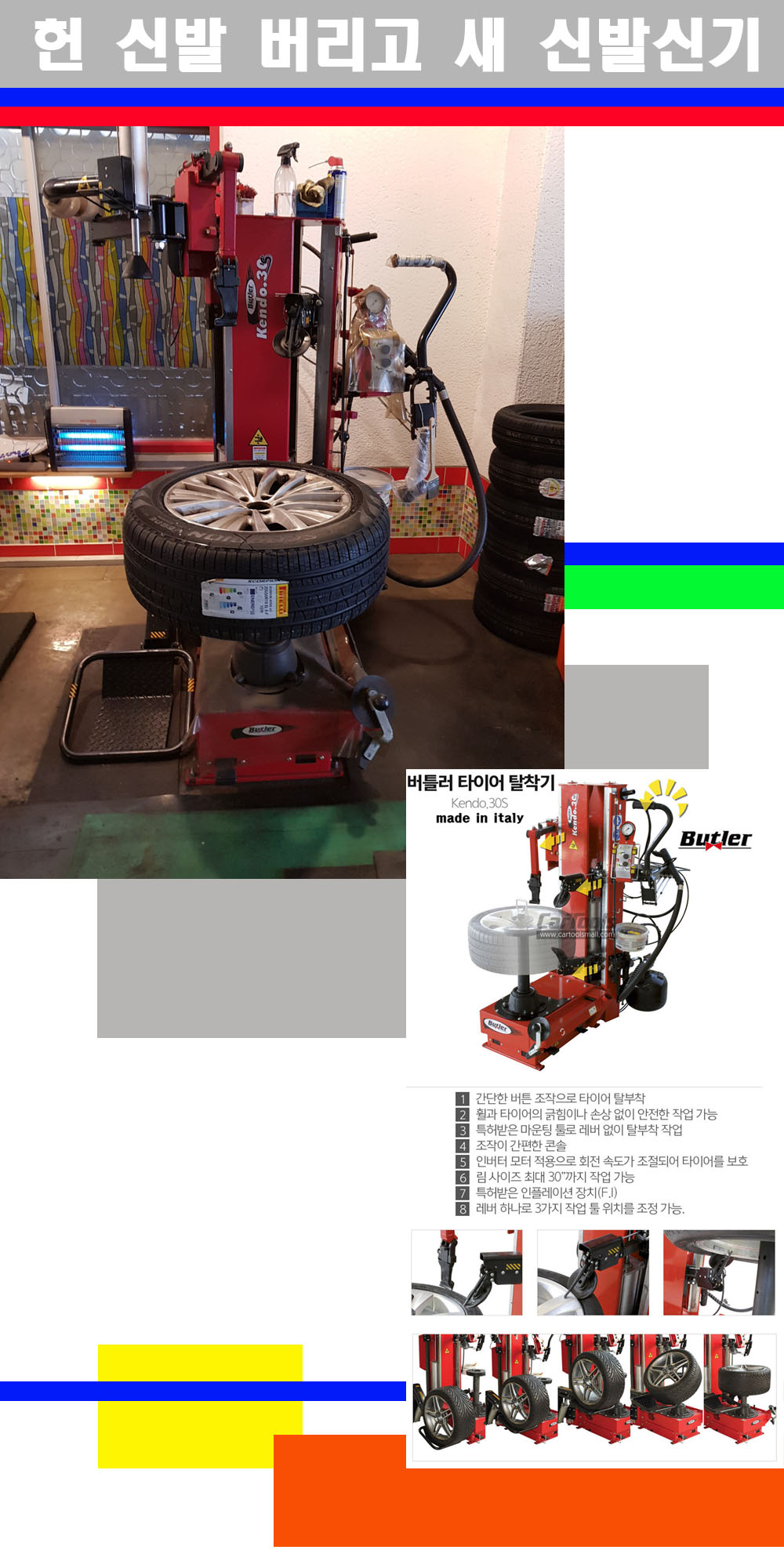 이태리 버틀러사의 켄도3.0S는 휠과 타이어와 조립과 분리시 전혀 제품에 손상을 주지않는 탈착기로 특히 센터락방식(중앙에서 휠를 고정하는 방식)이여서 휠의 중앙부위 잡아서 타이어를 탈부착하고 이후 상하롤러로 타이어를 탈부착합니다 특히 유니포미티작업(휠의 가장가벼운부분과 타이어의 가장 무거운부분을 매칭시키는 작업)시 작업자가 타이어를 정확한 지점에 휠과 매칭시킬수 있는 장점도 있습니다 유니포미티작업 불량시 과도한 진동값으로 핸들링불안 승차감저하 과도한 노면의 충격흡수를 가져와 주행감성을 해치는 첫번째 이유입니다 하지만 이런 작업을 무시하고 그냥 정적인 휠발란스작업만 하는것이 현실입니다 보통 타이어가격만 생각하시고 장착을 하시는데 꼭 이런 부분까지 챙길수 있는 샵을 권장합니다