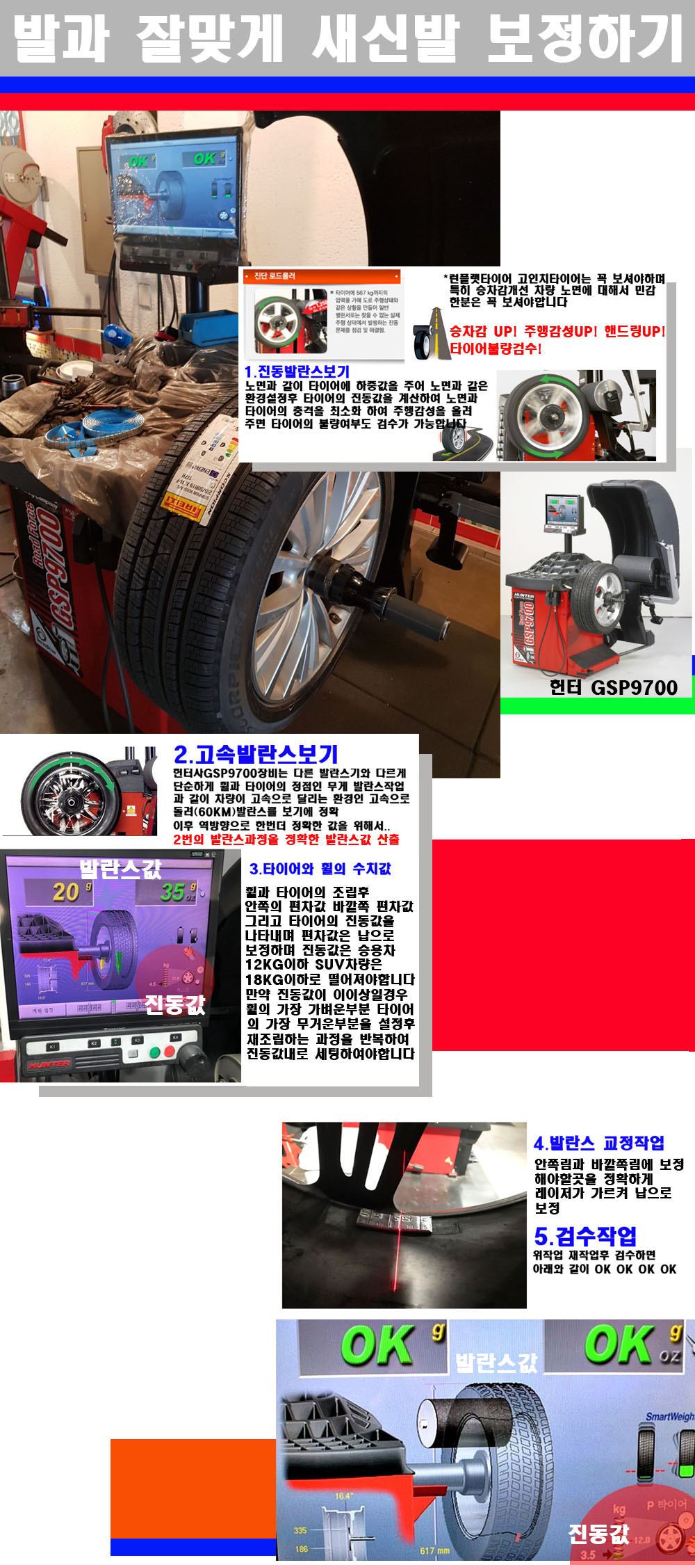 이후 미국 헌터사 GSP9700장비로 고속 및 진동발란스로 더욱더 작업의 정확도와 정밀도를 높였습니다 이장비는 노면에서 올라오는 진동값까지 계산하여 발란스값을 보는 방식으로 진동발란스기는 헌터사GSP9700장비가 유일합니다 이후 역방향으로 60키로의 고속으로 다시 발란스값을 보정하는 방식입니다 그래서 노면에서 올라오는 진동를 잡을수 있으며 특히 타이어의 노면력 측정으로 타이어의 불량여부까지도 검수가 가능한 장비입니다 특히 고속발란스 측정시 타사 발란스기와 틀리게 고속으로 발란스를 보기에 차량이 고속으로 달리는 시뮤레이션 구현이 가능하여 정확한 발란스값을 볼수가 있습니다 그리고 작업자에게는 불필요한 발란스납을 붙이지 않아 미관상으로 좋고 납을 절약하는 고객님에게도윈이고 작업자에게도 윈윈할수 있는 장비입니다 그리고 시중에서 고속진동발란스라고 말하시는 샵들이 많은데 꼭아셔야하는것은 고속발란스는 말그대로 발란스를 볼때 고속으로 돌리기에 60키로 전후 그리고 진동값을 계산하기위해서는 발란스기에 진동롤러가 있어야합니다 그래서 미국헌터사 GSP9700장비가 유일합니다 다른 샵에서 말하는 발란스기는 고속진동발란스기능없는 일반발란스 기기입니다 이점 꼭 아시고 장착하시기를 바랍니다