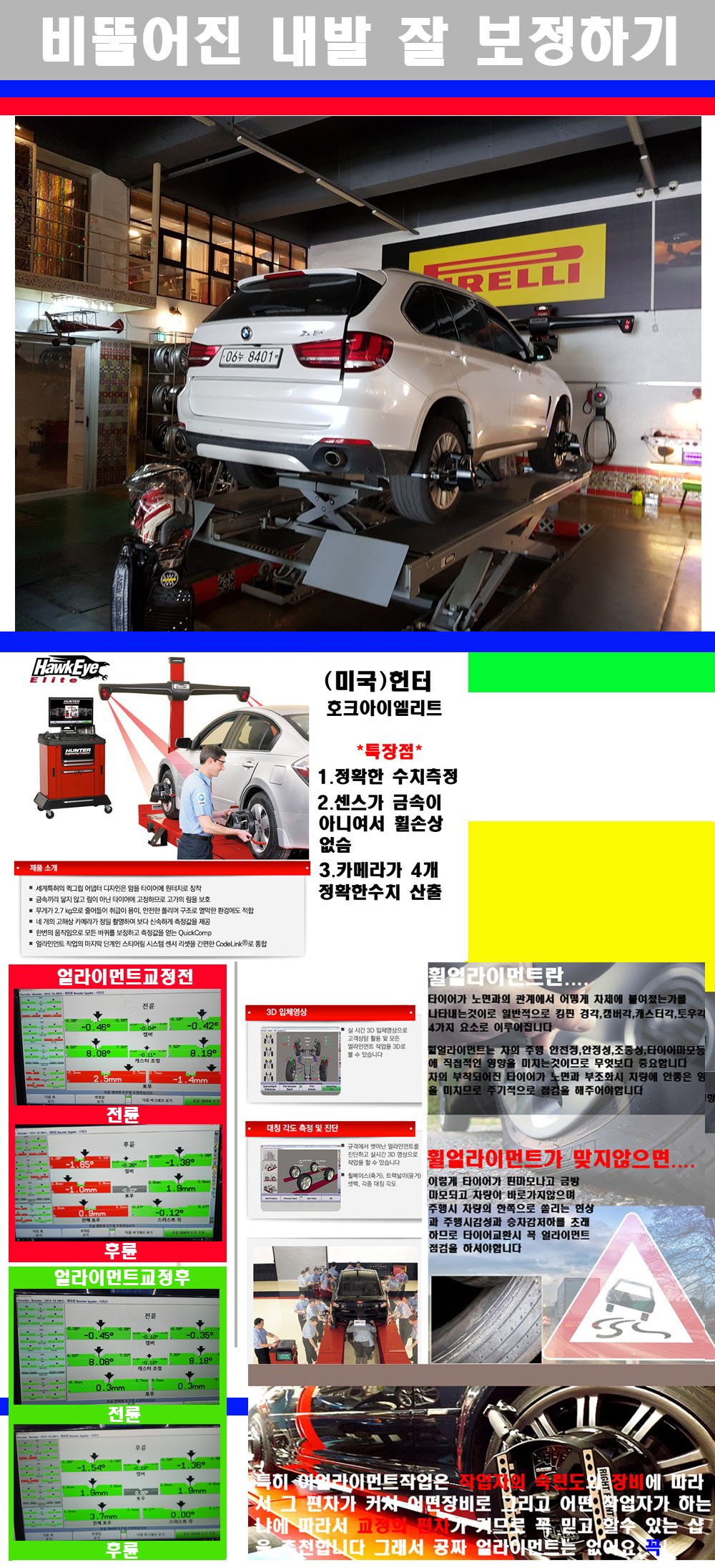 이후 미국 헌터사 호크아이엘리트 장비로 3D얼라이먼트를 진행했습니다 이장비는 현존하는 가장 진화된 얼라이먼트장비입니다 특히 4개의 고성능카메라가 장착되어져 있어 실시간으로 오차가 없는 측정값을 구현하며 바퀴당 각 휠센서 클램프가 프라스틱이며 타이어바닦면을 지지하는 방식이여서 휠의 손상이 없는것이 특징입니다 하지만 장비보다 차량의 얼라이먼트를 볼시 작업자의 정성과 그리고 능력과 숙련도가 관견이기에 꼭 휠얼라이먼트를 장사수단으로 하지않는 샵을 권장합니다 자사는 얼라이먼트정렬시 교정전 교정후를 구분하여 고객님께 직접 이수치값을 확인시켜드리고 작업을 하며 이후 각각의 특성을 가진 타이어들에 대해서 설명 및 관리요령 운전요령 같이 설명해드리고 있습니다 이후 타이어와 휠의 정확한 발란스값과 진동값을 보정후 헌터사 호크아이엘리트 3D얼라이먼트장비로 공장에서 처음 출고될시의 팩토리값으로 교정하였습니다 그리고 타이어질소가스주입기로 3번정도 진공상태로 만든후 질소가스를 주입했습니다 질소가스주입시 가장 관견은 순도이기에 이런 여러번의 진공상태후 주입하고 빼주는 과정를 많이 해주어야합니다 질소가스의 주입시 타이어공기압의 저하가 덜하고 화합물질이 반응을 하지않아 소음전파력과 그리고 타이어안쪽에 수분을 발생하지않으며 타이어안쪽에서의 공기압이 팽창하지않아 타이어에 스트레스를 덜주게 됩니다 하지만 이부분도 공기속에 질소가 80%정도 존재하기에 미미한 차이이지만 질소순도를 높이고 주행시 좋은 점이 확연히 많기에 질소주입을 해드리고 있습니다 특히 고성능타이어나 하중값을 많이 주는 타이어일경우에는 위에서 언급한 부분에서 많이 차이를 보이고 있습니다 이후 타이어왁싱후 출고했습니다+ 감사합니다 [2555019]BMW X5 피렐리타이어 스콜피온 베르디 올시즌 RFT 255/50R19