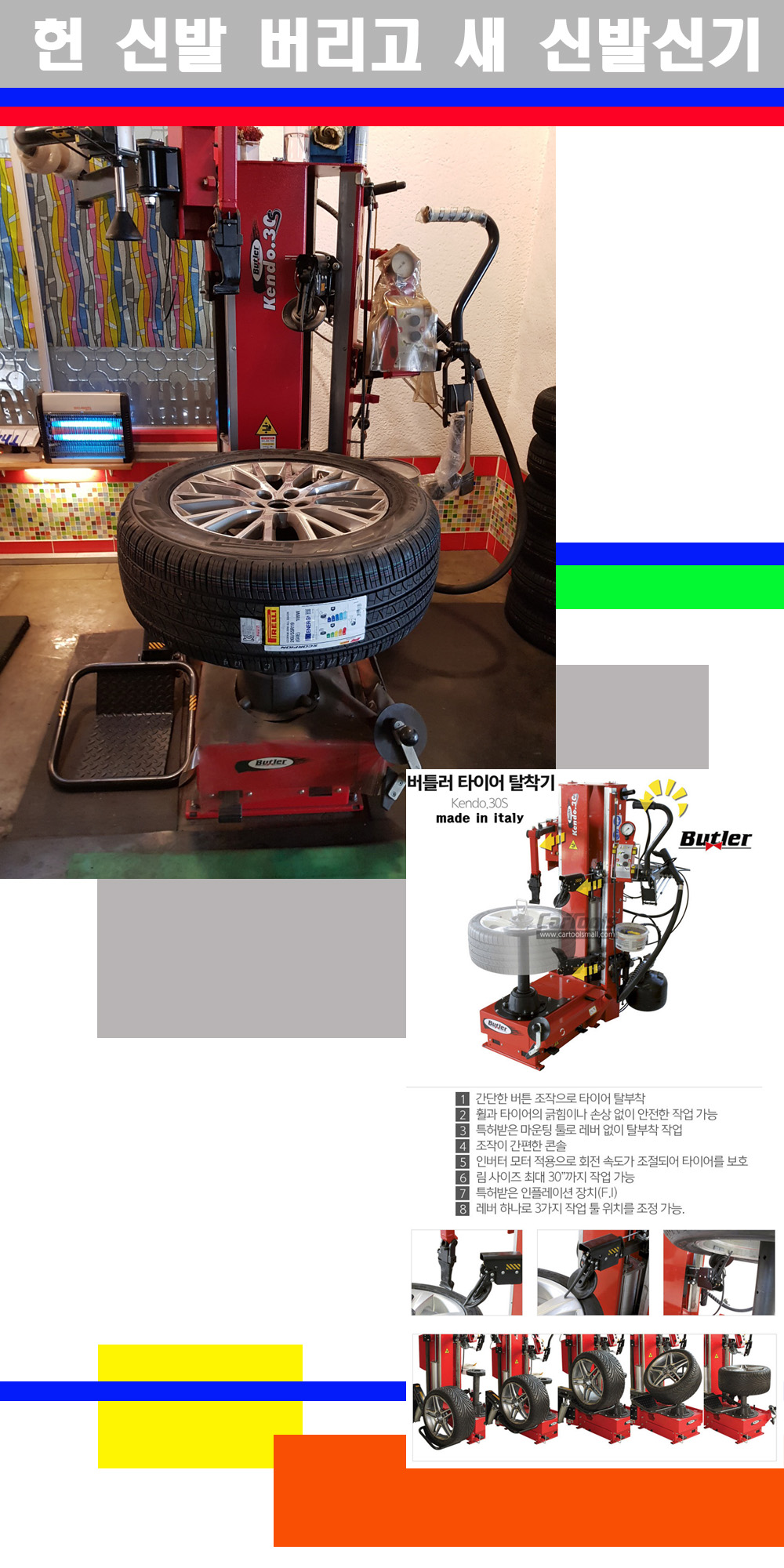 이태리 버틀러사의 켄도3.0S는 휠과 타이어와 조립과 분리시 전혀 제품에 손상을 주지않는 탈착기로 특히 센터락방식(중앙에서 휠를 고정하는 방식)이여서 휠의 중앙부위 잡아서 타이어를 탈부착하고 이후 상하롤러로 타이어를 탈부착합니다 특히 유니포미티작업(휠의 가장가벼운부분과 타이어의 가장 무거운부분을 매칭시키는 작업)시 작업자가 타이어를 정확한 지점에 휠과 매칭시킬수 있는 장점도 있습니다 유니포미티작업 불량시 과도한 진동값으로 핸들링불안 승차감저하 과도한 노면의 충격흡수를 가져와 주행감성을 해치는 첫번째 이유입니다 하지만 이런 작업을 무시하고 그냥 정적인 휠발란스작업만 하는것이 현실입니다 보통 타이어가격만 생각하시고 장착을 하시는데 꼭 이런 부분까지 챙길수 있는 샵을 권장합니다