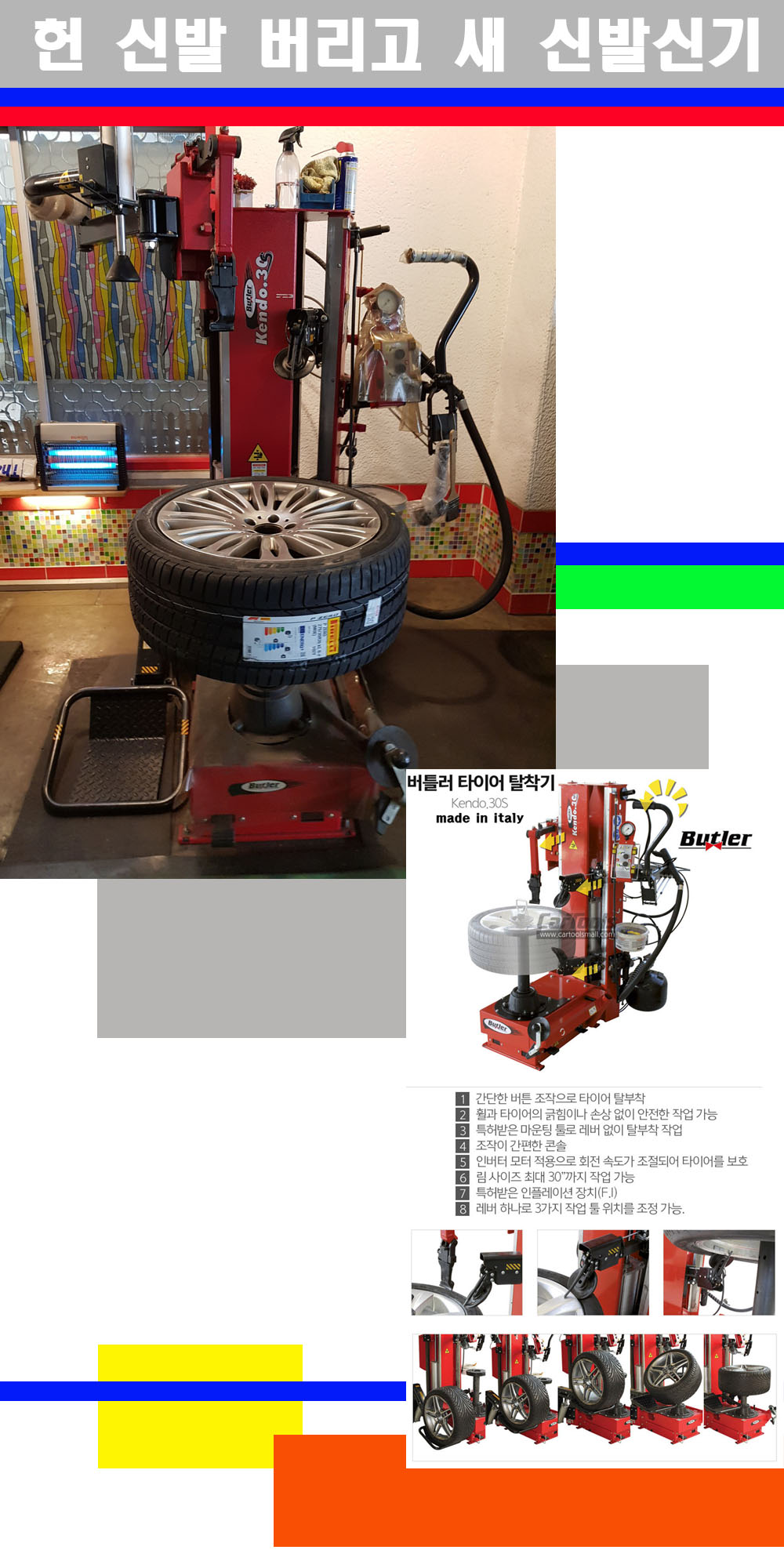 이태리 버틀러사의 켄도3.0S는 휠과 타이어와 조립과 분리시 전혀 제품에 손상을 주지않는 탈착기로 특히 센터락방식(중앙에서 휠를 고정하는 방식)이여서 휠의 중앙부위 잡아서 타이어를 탈부착하고 이후 상하롤러로 타이어를 탈부착합니다 특히 유니포미티작업(휠의 가장가벼운부분과 타이어의 가장 무거운부분을 매칭시키는 작업)시 작업자가 타이어를 정확한 지점에 휠과 매칭시킬수 있는 장점도 있습니다 유니포미티작업 불량시 과도한 진동값으로 핸들링불안 승차감저하 과도한 노면의 충격흡수를 가져와 주행감성을 해치는 첫번째 이유입니다 하지만 이런 작업을 무시하고 그냥 정적인 휠발란스작업만 하는것이 현실입니다 보통 타이어가격만 생각하시고 장착을 하시는데 꼭 이런 부분까지 챙길수 있는 샵을 권장합니다