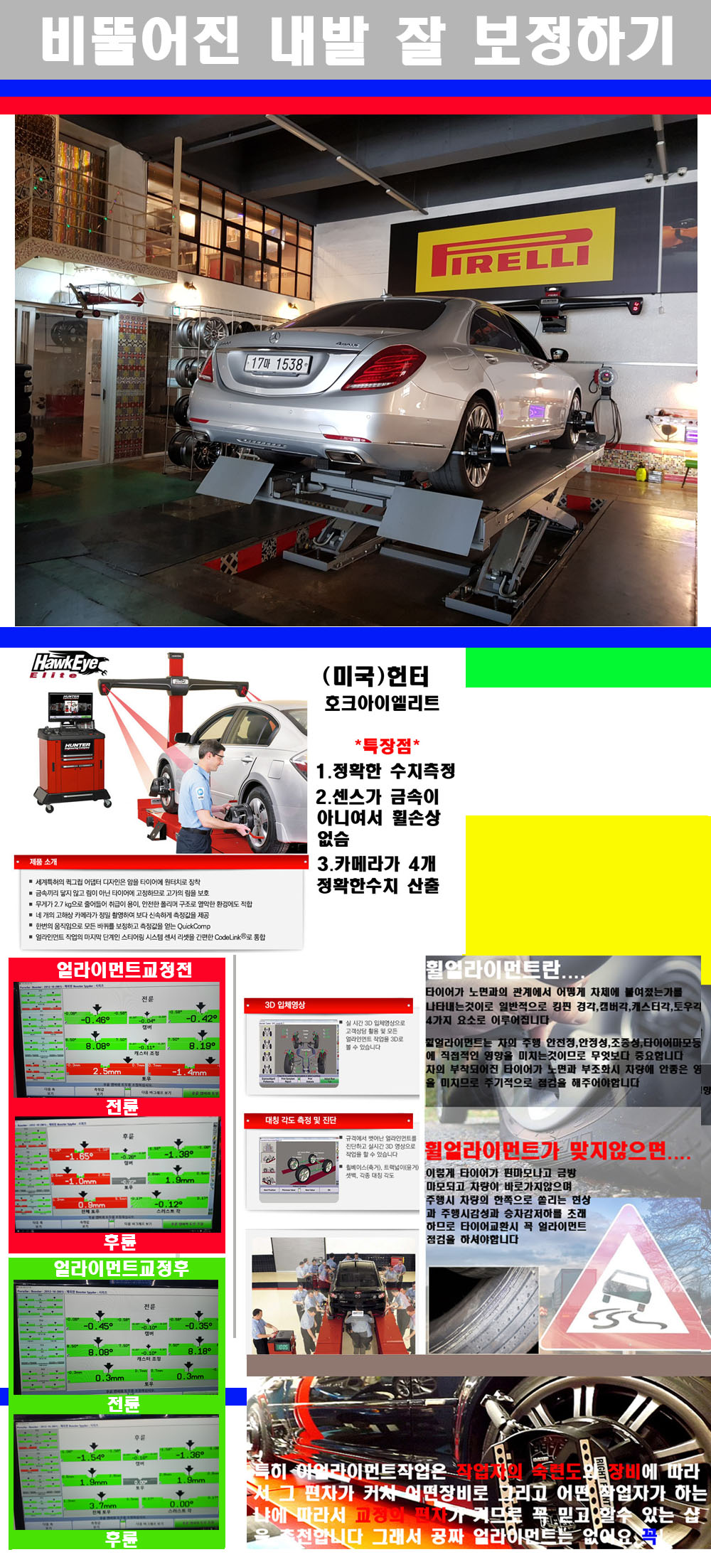 이후 미국 헌터사 호크아이엘리트 장비로 3D얼라이먼트를 진행했습니다 이장비는 현존하는 가장 진화된 얼라이먼트장비입니다 특히 4개의 고성능카메라가 장착되어져 있어 실시간으로 오차가 없는 측정값을 구현하며 바퀴당 각 휠센서 클램프가 프라스틱이며 타이어바닦면을 지지하는 방식이여서 휠의 손상이 없는것이 특징입니다 하지만 장비보다 차량의 얼라이먼트를 볼시 작업자의 정성과 그리고 능력과 숙련도가 관견이기에 꼭 휠얼라이먼트를 장사수단으로 하지않는 샵을 권장합니다 자사는 얼라이먼트정렬시 교정전 교정후를 구분하여 고객님께 직접 이수치값을 확인시켜드리고 작업을 하며 이후 각각의 특성을 가진 타이어들에 대해서 설명 및 관리요령 운전요령 같이 설명해드리고 있습니다 이후 타이어와 휠의 정확한 발란스값과 진동값을 보정후 헌터사 호크아이엘리트 3D얼라이먼트장비로 공장에서 처음 출고될시의 팩토리값으로 교정하였습니다 그리고 타이어질소가스주입기로 3번정도 진공상태로 만든후 질소가스를 주입했습니다 질소가스주입시 가장 관견은 순도이기에 이런 여러번의 진공상태후 주입하고 빼주는 과정를 많이 해주어야합니다 질소가스의 주입시 타이어공기압의 저하가 덜하고 화합물질이 반응을 하지않아 소음전파력과 그리고 타이어안쪽에 수분을 발생하지않으며 타이어안쪽에서의 공기압이 팽창하지않아 타이어에 스트레스를 덜주게 됩니다 하지만 이부분도 공기속에 질소가 80%정도 존재하기에 미미한 차이이지만 질소순도를 높이고 주행시 좋은 점이 확연히 많기에 질소주입을 해드리고 있습니다 특히 고성능타이어나 하중값을 많이 주는 타이어일경우에는 위에서 언급한 부분에서 많이 차이를 보이고 있습니다 이후 타이어왁싱후 출고했습니다+ 감사합니다
