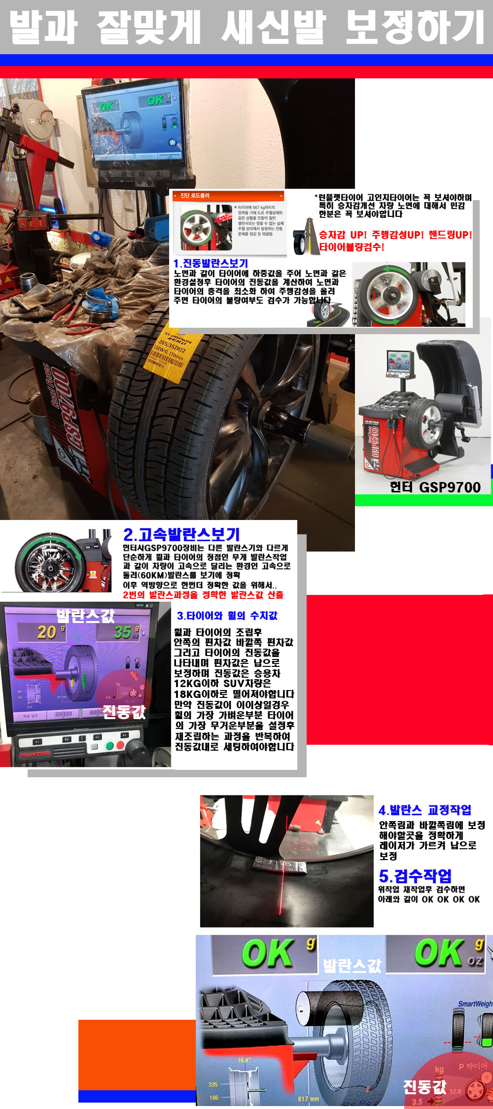 이후 미국 헌터사 GSP9700장비로 고속 및 진동발란스로 더욱더 작업의 정확도와 정밀도를 높였습니다 이장비는 노면에서 올라오는 진동값까지 계산하여 발란스값을 보는 방식으로 진동발란스기는 헌터사GSP9700장비가 유일합니다 이후 역방향으로 60키로의 고속으로 다시 발란스값을 보정하는 방식입니다 그래서 노면에서 올라오는 진동를 잡을수 있으며 특히 타이어의 노면력 측정으로 타이어의 불량여부까지도 검수가 가능한 장비입니다 특히 고속발란스 측정시 타사 발란스기와 틀리게 고속으로 발란스를 보기에 차량이 고속으로 달리는 시뮤레이션 구현이 가능하여 정확한 발란스값을 볼수가 있습니다 그리고 작업자에게는 불필요한 발란스납을 붙이지 않아 미관상으로 좋고 납을 절약하는 고객님에게도윈이고 작업자에게도 윈윈할수 있는 장비입니다 그리고 시중에서 고속진동발란스라고 말하시는 샵들이 많은데 꼭아셔야하는것은 고속발란스는 말그대로 발란스를 볼때 고속으로 돌리기에 60키로 전후 그리고 진동값을 계산하기위해서는 발란스기에 진동롤러가 있어야합니다 그래서 미국헌터사 GSP9700장비가 유일합니다 다른 샵에서 말하는 발란스기는 고속진동발란스기능없는 일반발란스 기기입니다 이점 꼭 아시고 장착하시기를 바랍니다