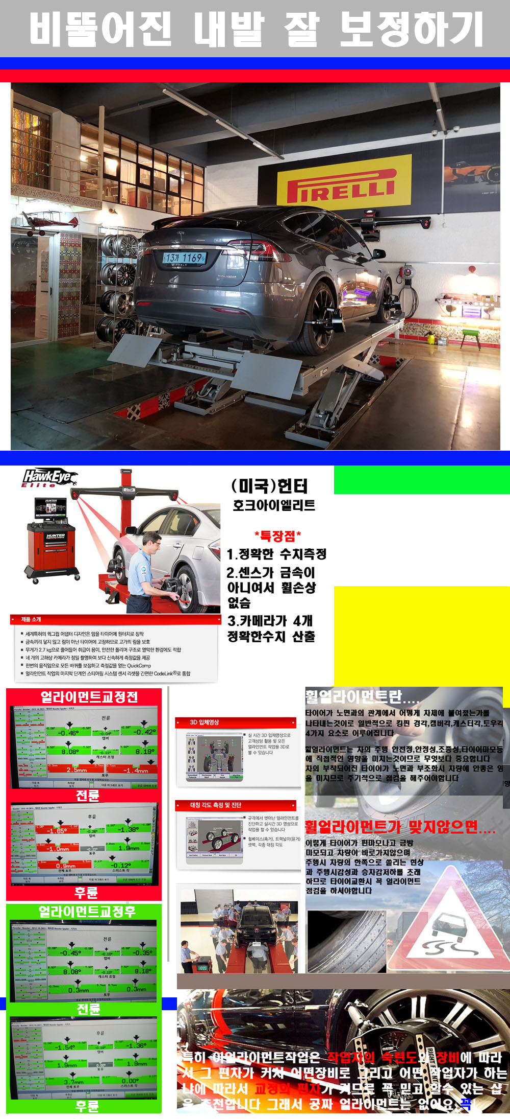 이후 미국 헌터사 호크아이엘리트 장비로 3D얼라이먼트를 진행했습니다 이장비는 현존하는 가장 진화된 얼라이먼트장비입니다 특히 4개의 고성능카메라가 장착되어져 있어 실시간으로 오차가 없는 측정값을 구현하며 바퀴당 각 휠센서 클램프가 프라스틱이며 타이어바닦면을 지지하는 방식이여서 휠의 손상이 없는것이 특징입니다 하지만 장비보다 차량의 얼라이먼트를 볼시 작업자의 정성과 그리고 능력과 숙련도가 관견이기에 꼭 휠얼라이먼트를 장사수단으로 하지않는 샵을 권장합니다 자사는 얼라이먼트정렬시 교정전 교정후를 구분하여 고객님께 직접 이수치값을 확인시켜드리고 작업을 하며 이후 각각의 특성을 가진 타이어들에 대해서 설명 및 관리요령 운전요령 같이 설명해드리고 있습니다 이후 타이어와 휠의 정확한 발란스값과 진동값을 보정후 헌터사 호크아이엘리트 3D얼라이먼트장비로 공장에서 처음 출고될시의 팩토리값으로 교정하였습니다 그리고 타이어질소가스주입기로 3번정도 진공상태로 만든후 질소가스를 주입했습니다 질소가스주입시 가장 관견은 순도이기에 이런 여러번의 진공상태후 주입하고 빼주는 과정를 많이 해주어야합니다 질소가스의 주입시 타이어공기압의 저하가 덜하고 화합물질이 반응을 하지않아 소음전파력과 그리고 타이어안쪽에 수분을 발생하지않으며 타이어안쪽에서의 공기압이 팽창하지않아 타이어에 스트레스를 덜주게 됩니다 하지만 이부분도 공기속에 질소가 80%정도 존재하기에 미미한 차이이지만 질소순도를 높이고 주행시 좋은 점이 확연히 많기에 질소주입을 해드리고 있습니다 특히 고성능타이어나 하중값을 많이 주는 타이어일경우에는 위에서 언급한 부분에서 많이 차이를 보이고 있습니다 이후 타이어왁싱후 출고했습니다+ 감사합니다
