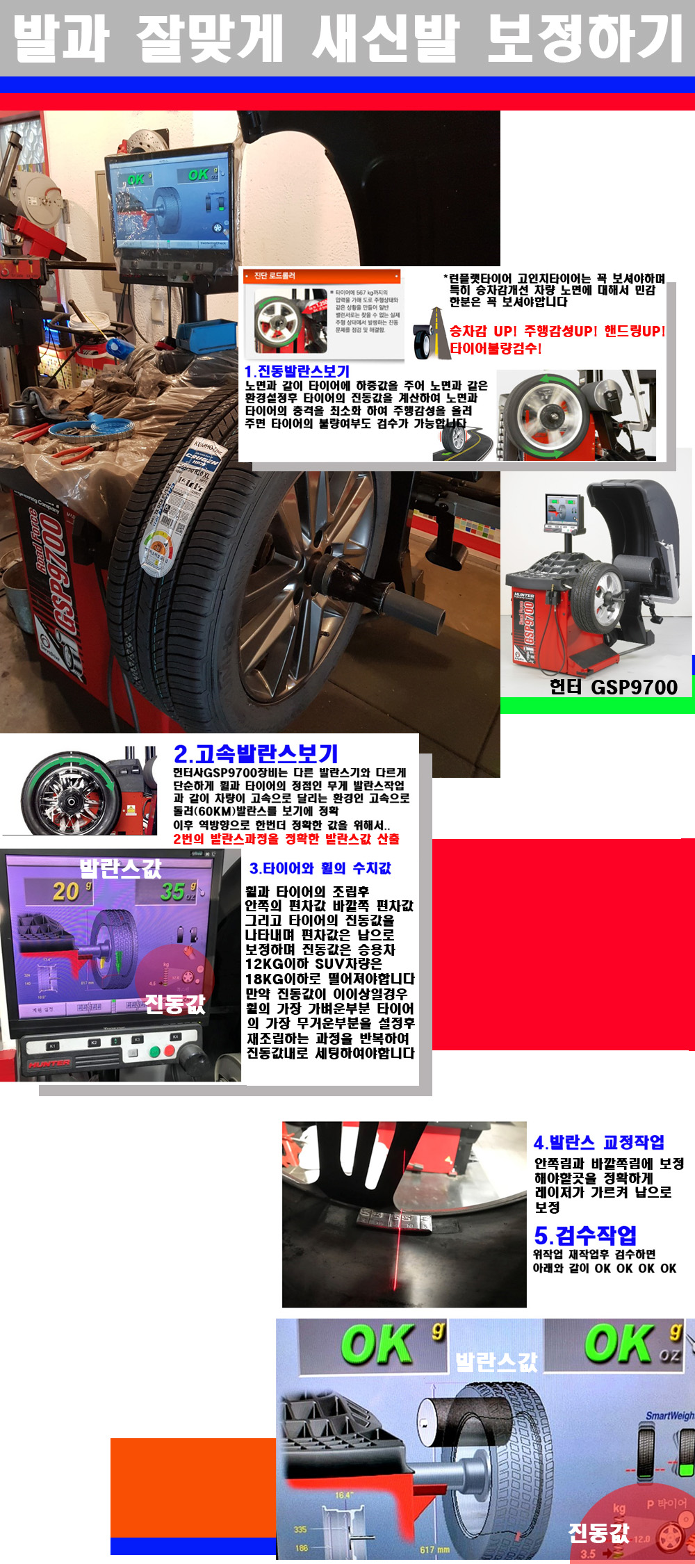 이후 미국 헌터사 GSP9700장비로 고속 및 진동발란스로 더욱더 작업의 정확도와 정밀도를 높였습니다 이장비는 노면에서 올라오는 진동값까지 계산하여 발란스값을 보는 방식으로 진동발란스기는 헌터사GSP9700장비가 유일합니다 이후 역방향으로 60키로의 고속으로 다시 발란스값을 보정하는 방식입니다 그래서 노면에서 올라오는 진동를 잡을수 있으며 특히 타이어의 노면력 측정으로 타이어의 불량여부까지도 검수가 가능한 장비입니다 특히 고속발란스 측정시 타사 발란스기와 틀리게 고속으로 발란스를 보기에 차량이 고속으로 달리는 시뮤레이션 구현이 가능하여 정확한 발란스값을 볼수가 있습니다 그리고 작업자에게는 불필요한 발란스납을 붙이지 않아 미관상으로 좋고 납을 절약하는 고객님에게도윈이고 작업자에게도 윈윈할수 있는 장비입니다 그리고 시중에서 고속진동발란스라고 말하시는 샵들이 많은데 꼭아셔야하는것은 고속발란스는 말그대로 발란스를 볼때 고속으로 돌리기에 60키로 전후 그리고 진동값을 계산하기위해서는 발란스기에 진동롤러가 있어야합니다 그래서 미국헌터사 GSP9700장비가 유일합니다 다른 샵에서 말하는 발란스기는 고속진동발란스기능없는 일반발란스 기기입니다 이점 꼭 아시고 장착하시기를 바랍니다