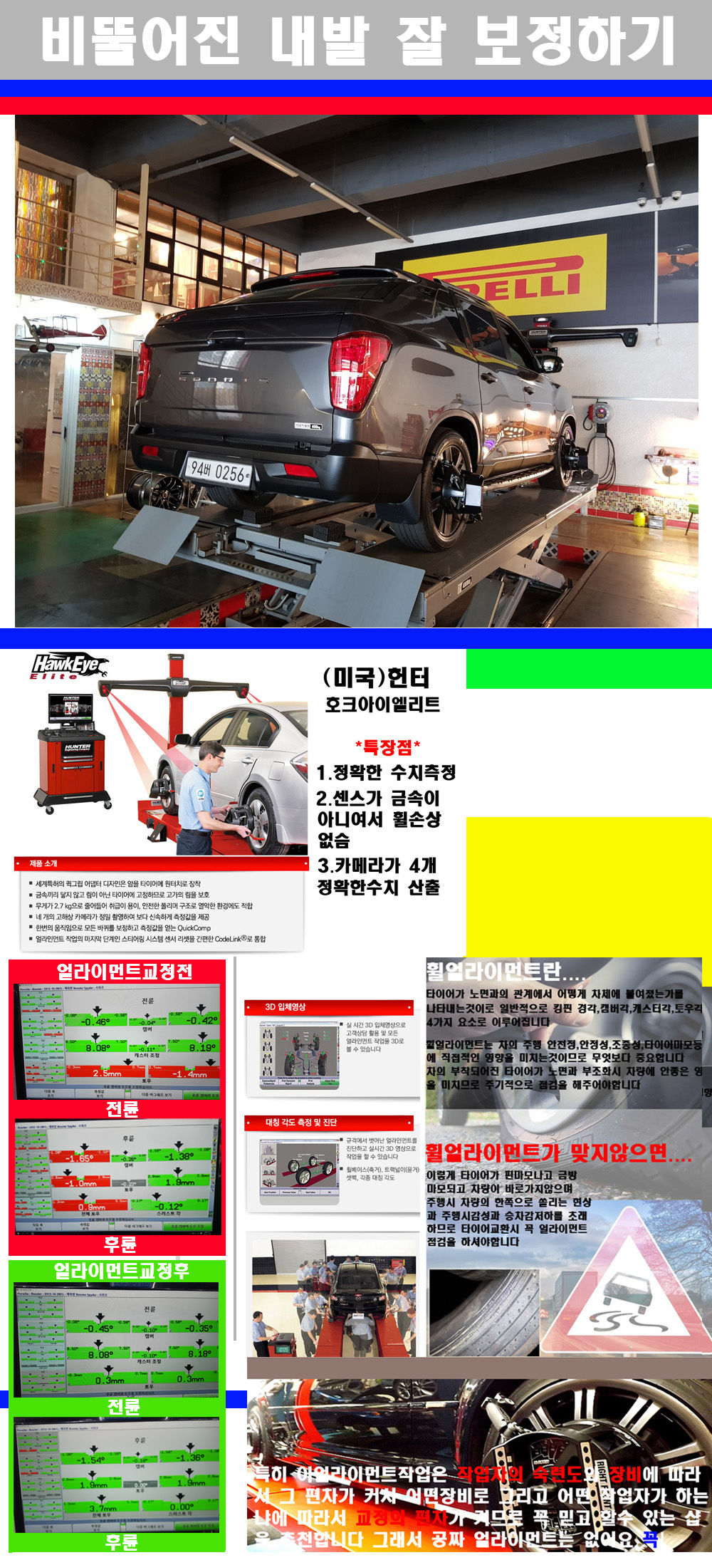 이후 미국 헌터사 호크아이엘리트 장비로 3D얼라이먼트를 진행했습니다 이장비는 현존하는 가장 진화된 얼라이먼트장비입니다 특히 4개의 고성능카메라가 장착되어져 있어 실시간으로 오차가 없는 측정값을 구현하며 바퀴당 각 휠센서 클램프가 프라스틱이며 타이어바닦면을 지지하는 방식이여서 휠의 손상이 없는것이 특징입니다 하지만 장비보다 차량의 얼라이먼트를 볼시 작업자의 정성과 그리고 능력과 숙련도가 관견이기에 꼭 휠얼라이먼트를 장사수단으로 하지않는 샵을 권장합니다 자사는 얼라이먼트정렬시 교정전 교정후를 구분하여 고객님께 직접 이수치값을 확인시켜드리고 작업을 하며 이후 각각의 특성을 가진 타이어들에 대해서 설명 및 관리요령 운전요령 같이 설명해드리고 있습니다 이후 타이어와 휠의 정확한 발란스값과 진동값을 보정후 헌터사 호크아이엘리트 3D얼라이먼트장비로 공장에서 처음 출고될시의 팩토리값으로 교정하였습니다 그리고 타이어질소가스주입기로 3번정도 진공상태로 만든후 질소가스를 주입했습니다 질소가스주입시 가장 관견은 순도이기에 이런 여러번의 진공상태후 주입하고 빼주는 과정를 많이 해주어야합니다 질소가스의 주입시 타이어공기압의 저하가 덜하고 화합물질이 반응을 하지않아 소음전파력과 그리고 타이어안쪽에 수분을 발생하지않으며 타이어안쪽에서의 공기압이 팽창하지않아 타이어에 스트레스를 덜주게 됩니다 하지만 이부분도 공기속에 질소가 80%정도 존재하기에 미미한 차이이지만 질소순도를 높이고 주행시 좋은 점이 확연히 많기에 질소주입을 해드리고 있습니다 특히 고성능타이어나 하중값을 많이 주는 타이어일경우에는 위에서 언급한 부분에서 많이 차이를 보이고 있습니다 이후 타이어왁싱후 출고했습니다+ 감사합니다