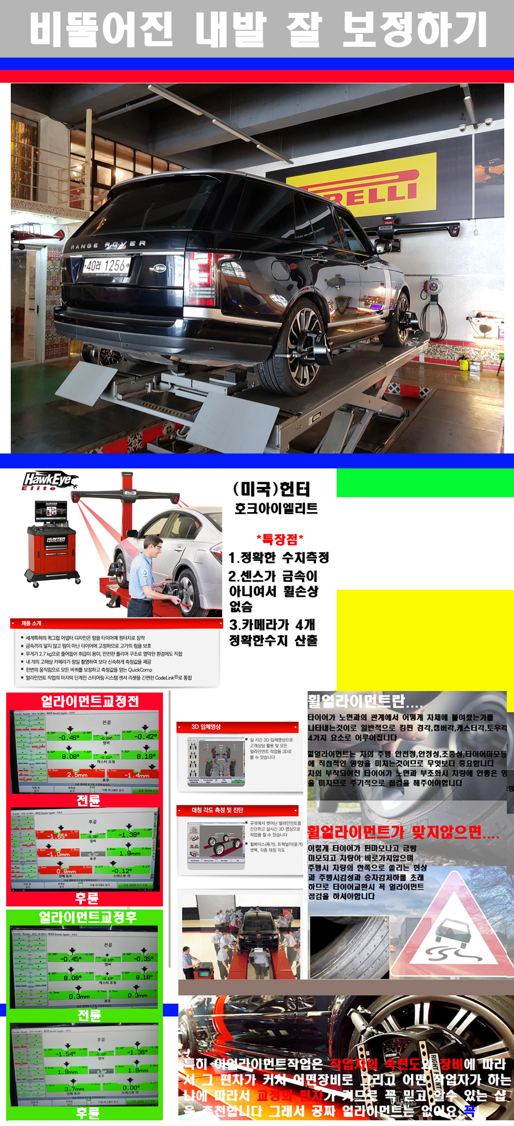 이후 미국 헌터사 호크아이엘리트 장비로 3D얼라이먼트를 진행했습니다 이장비는 현존하는 가장 진화된 얼라이먼트장비입니다 특히 4개의 고성능카메라가 장착되어져 있어 실시간으로 오차가 없는 측정값을 구현하며 바퀴당 각 휠센서 클램프가 프라스틱이며 타이어바닦면을 지지하는 방식이여서 휠의 손상이 없는것이 특징입니다 하지만 장비보다 차량의 얼라이먼트를 볼시 작업자의 정성과 그리고 능력과 숙련도가 관견이기에 꼭 휠얼라이먼트를 장사수단으로 하지않는 샵을 권장합니다 자사는 얼라이먼트정렬시 교정전 교정후를 구분하여 고객님께 직접 이수치값을 확인시켜드리고 작업을 하며 이후 각각의 특성을 가진 타이어들에 대해서 설명 및 관리요령 운전요령 같이 설명해드리고 있습니다 이후 타이어와 휠의 정확한 발란스값과 진동값을 보정후 헌터사 호크아이엘리트 3D얼라이먼트장비로 공장에서 처음 출고될시의 팩토리값으로 교정하였습니다 그리고 타이어질소가스주입기로 3번정도 진공상태로 만든후 질소가스를 주입했습니다 질소가스주입시 가장 관견은 순도이기에 이런 여러번의 진공상태후 주입하고 빼주는 과정를 많이 해주어야합니다 질소가스의 주입시 타이어공기압의 저하가 덜하고 화합물질이 반응을 하지않아 소음전파력과 그리고 타이어안쪽에 수분을 발생하지않으며 타이어안쪽에서의 공기압이 팽창하지않아 타이어에 스트레스를 덜주게 됩니다 하지만 이부분도 공기속에 질소가 80%정도 존재하기에 미미한 차이이지만 질소순도를 높이고 주행시 좋은 점이 확연히 많기에 질소주입을 해드리고 있습니다 특히 고성능타이어나 하중값을 많이 주는 타이어일경우에는 위에서 언급한 부분에서 많이 차이를 보이고 있습니다 이후 타이어왁싱후 출고했습니다+ 감사합니다