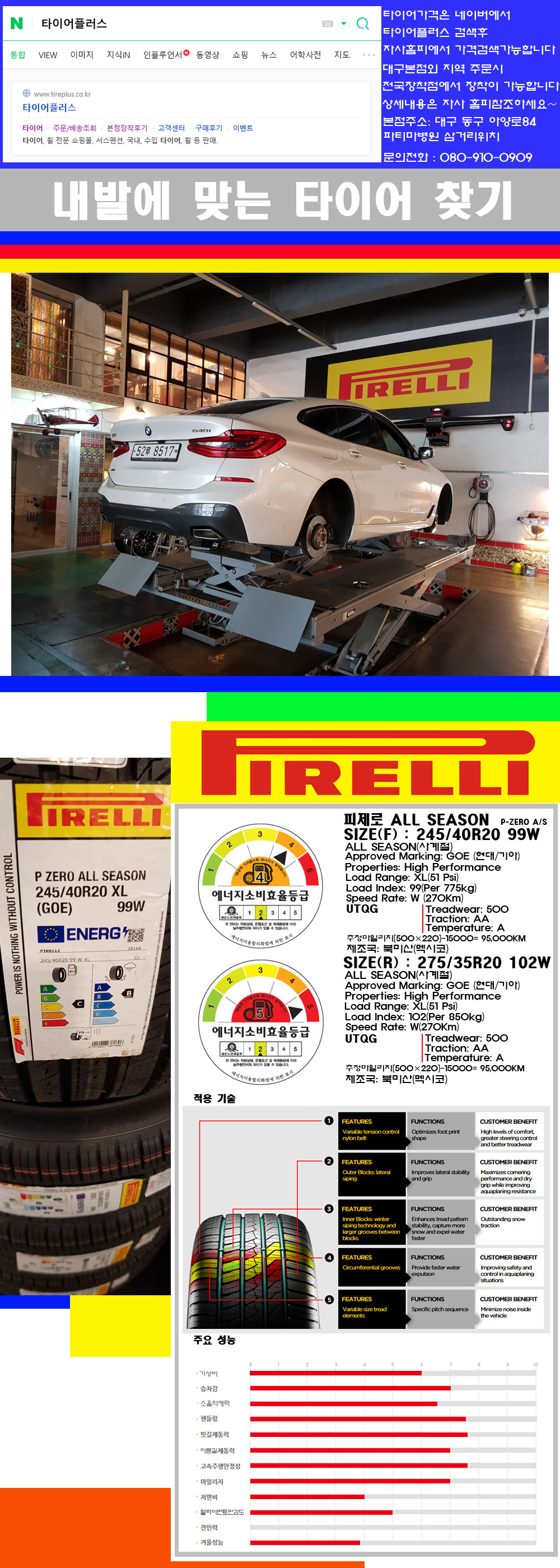 ♥♥♥본점 대구 동구 아양로84 (파티마삼거리 위치) 국산 수입타이어 할인행사중♥♥♥ 타이어플러스 대구본점은 전국에서 가장 규모가 큰매장입니다 물론 자사는 지하층 지상4층건물이며 1층작업장이외는 모두 창고로 사용중인 회사입니다 대구광역시 동구 아양로84(파티마병원 네거리에 위치)그래서 매장으로 바로 오시면 당일에 바로 장착이 가능합니다 물론 한국 금호 넥센 브리지스톤 미쉐린 콘티넨탈 피렐리 던롭 굳이어 요코하마 등 세계유수의 10대 브랜드타이어만 취급하고 있습니다 타이어매장중 단일규모로는 아마 전국에서 제일 커지않을까 생각합니다 가격도 인터넷 최저가로 장착해 드리고 있습니다 고객님들이 오시면서 너무 고급스러워 가격도 비싸지 않을까 생각하시는데 네이버에서 타이어플러스사이트를 검색해보시면 가격 또한 정말 싸게 판매하고 있구나 하고 생각하실것입니다 물론 장비도 현존하는 장비중 가장 최신장비와 그리고 유럽풍 인테리어의 최고급매장입니다 무엇하나 정품만 취급하며 작업또한 꼼꼼하게 매뉴얼에 따라서 작업을 해드립니다 특히 사장님의 이력이 화려한데 자동차경주 레이스와 미캐닉 국제자격증(A)소지자로서 경험한 풍부한 자동차의 지식을 갖춘분이십니다 특히 자동차잡지사에 타이어에 관한 내용도 기재하신 분이며 타이어회사의 타이어테스트드라이브로도 참여한 분이십니다 제품의 품질이나 제품의 성능등을 장사수단으로 말하지 않고 있는 그대로 말해드리며 특히 사장님 성격상 거짓말을 못하는 성격이여서 믿고 맡겨주시면 후회하지 않을 것입니다 그래서 사장님께서 직접상담해주시고 장착도 해주시는 매장이기에 더 신뢰가 가지 않을까 생각합니다 자사는 인터넷 최저가 기반으로 성장한 회사이기에 가격또한 인터넷 최저가로 장착해 드리고 있습니다 그리고 자사는 고객만족도에서 대상까지 수상한 회사입니다 그래서 한번 저의 매장에서 작업하신 고객님은 아마 다른곳에서는 아마 눈에 차지 않을것이라 생각합니다 가격이면 가격 작업의 완성도면 완성도 그리고 사후 관리까지 최고중에 최고가 되기위해서 노력하는 매장입니다 지금까지 어느 매장에서도 느끼지 못한 감성들을 느끼시기를 바랍니다 감사합니다