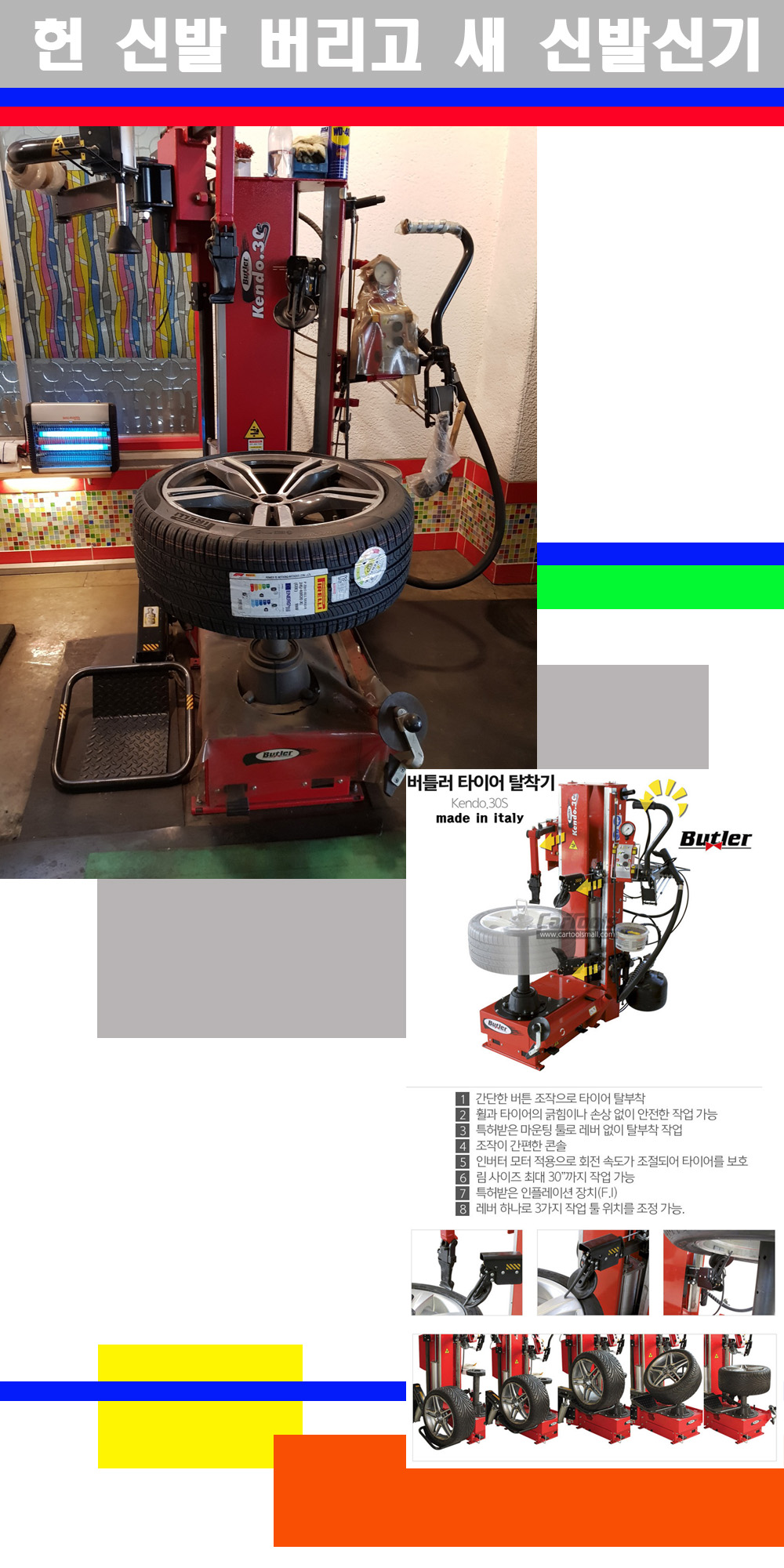 이태리 버틀러사의 켄도3.0S는 휠과 타이어와 조립과 분리시 전혀 제품에 손상을 주지않는 탈착기로 특히 센터락방식(중앙에서 휠를 고정하는 방식)이여서 휠의 중앙부위 잡아서 타이어를 탈부착하고 이후 상하롤러로 타이어를 탈부착합니다 특히 유니포미티작업(휠의 가장가벼운부분과 타이어의 가장 무거운부분을 매칭시키는 작업)시 작업자가 타이어를 정확한 지점에 휠과 매칭시킬수 있는 장점도 있습니다 유니포미티작업 불량시 과도한 진동값으로 핸들링불안 승차감저하 과도한 노면의 충격흡수를 가져와 주행감성을 해치는 첫번째 이유입니다 하지만 이런 작업을 무시하고 그냥 정적인 휠발란스작업만 하는것이 현실입니다 보통 타이어가격만 생각하시고 장착을 하시는데 꼭 이런 부분까지 챙길수 있는 샵을 권장합니다