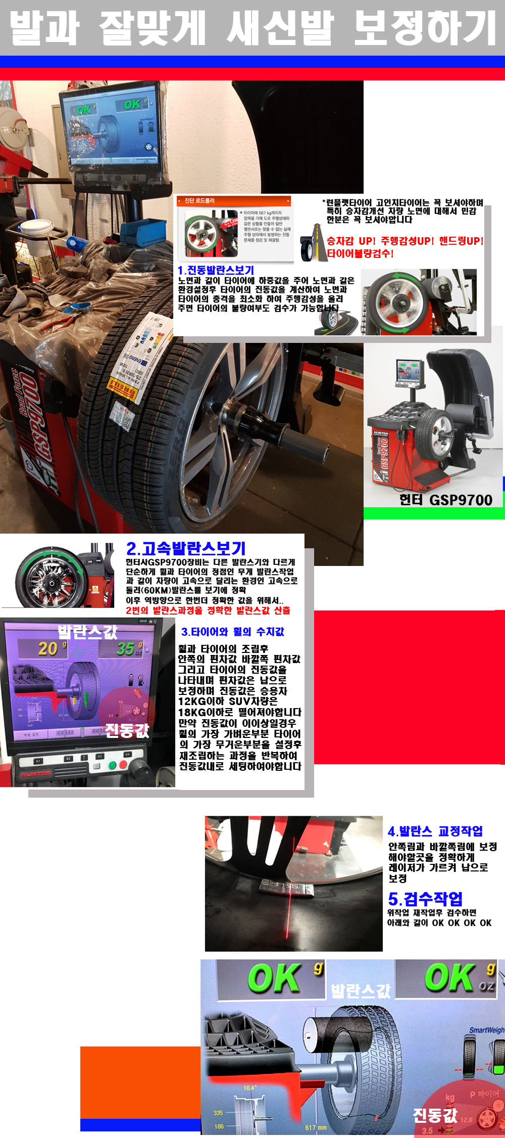 이후 미국 헌터사 GSP9700장비로 고속 및 진동발란스로 더욱더 작업의 정확도와 정밀도를 높였습니다 이장비는 노면에서 올라오는 진동값까지 계산하여 발란스값을 보는 방식으로 진동발란스기는 헌터사GSP9700장비가 유일합니다 이후 역방향으로 60키로의 고속으로 다시 발란스값을 보정하는 방식입니다 그래서 노면에서 올라오는 진동를 잡을수 있으며 특히 타이어의 노면력 측정으로 타이어의 불량여부까지도 검수가 가능한 장비입니다 특히 고속발란스 측정시 타사 발란스기와 틀리게 고속으로 발란스를 보기에 차량이 고속으로 달리는 시뮤레이션 구현이 가능하여 정확한 발란스값을 볼수가 있습니다 그리고 작업자에게는 불필요한 발란스납을 붙이지 않아 미관상으로 좋고 납을 절약하는 고객님에게도윈이고 작업자에게도 윈윈할수 있는 장비입니다 그리고 시중에서 고속진동발란스라고 말하시는 샵들이 많은데 꼭아셔야하는것은 고속발란스는 말그대로 발란스를 볼때 고속으로 돌리기에 60키로 전후 그리고 진동값을 계산하기위해서는 발란스기에 진동롤러가 있어야합니다 그래서 미국헌터사 GSP9700장비가 유일합니다 다른 샵에서 말하는 발란스기는 고속진동발란스기능없는 일반발란스 기기입니다 이점 꼭 아시고 장착하시기를 바랍니다