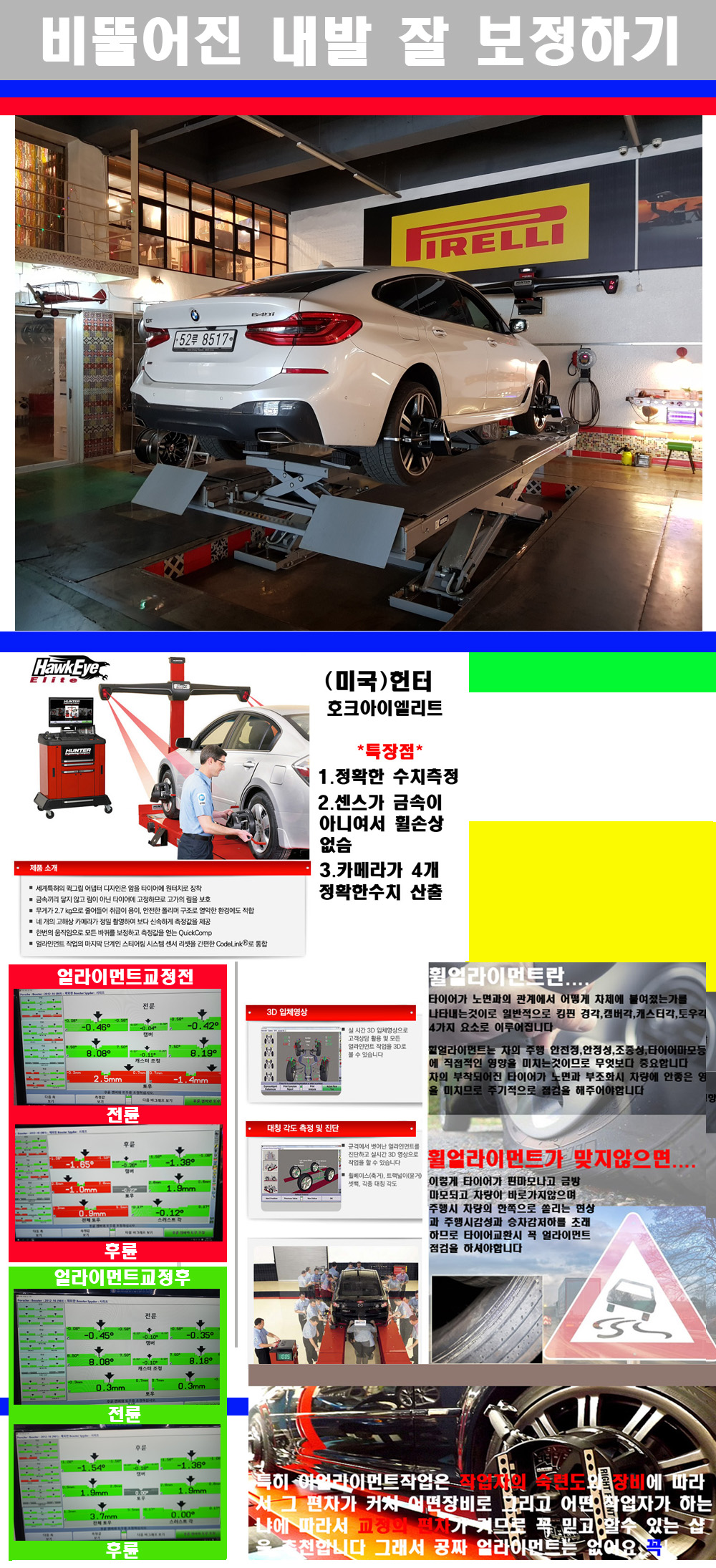 이후 미국 헌터사 호크아이엘리트 장비로 3D얼라이먼트를 진행했습니다 이장비는 현존하는 가장 진화된 얼라이먼트장비입니다 특히 4개의 고성능카메라가 장착되어져 있어 실시간으로 오차가 없는 측정값을 구현하며 바퀴당 각 휠센서 클램프가 프라스틱이며 타이어바닦면을 지지하는 방식이여서 휠의 손상이 없는것이 특징입니다 하지만 장비보다 차량의 얼라이먼트를 볼시 작업자의 정성과 그리고 능력과 숙련도가 관견이기에 꼭 휠얼라이먼트를 장사수단으로 하지않는 샵을 권장합니다 자사는 얼라이먼트정렬시 교정전 교정후를 구분하여 고객님께 직접 이수치값을 확인시켜드리고 작업을 하며 이후 각각의 특성을 가진 타이어들에 대해서 설명 및 관리요령 운전요령 같이 설명해드리고 있습니다 이후 타이어와 휠의 정확한 발란스값과 진동값을 보정후 헌터사 호크아이엘리트 3D얼라이먼트장비로 공장에서 처음 출고될시의 팩토리값으로 교정하였습니다 그리고 타이어질소가스주입기로 3번정도 진공상태로 만든후 질소가스를 주입했습니다 질소가스주입시 가장 관견은 순도이기에 이런 여러번의 진공상태후 주입하고 빼주는 과정를 많이 해주어야합니다 질소가스의 주입시 타이어공기압의 저하가 덜하고 화합물질이 반응을 하지않아 소음전파력과 그리고 타이어안쪽에 수분을 발생하지않으며 타이어안쪽에서의 공기압이 팽창하지않아 타이어에 스트레스를 덜주게 됩니다 하지만 이부분도 공기속에 질소가 80%정도 존재하기에 미미한 차이이지만 질소순도를 높이고 주행시 좋은 점이 확연히 많기에 질소주입을 해드리고 있습니다 특히 고성능타이어나 하중값을 많이 주는 타이어일경우에는 위에서 언급한 부분에서 많이 차이를 보이고 있습니다 이후 타이어왁싱후 출고했습니다+ 감사합니다
