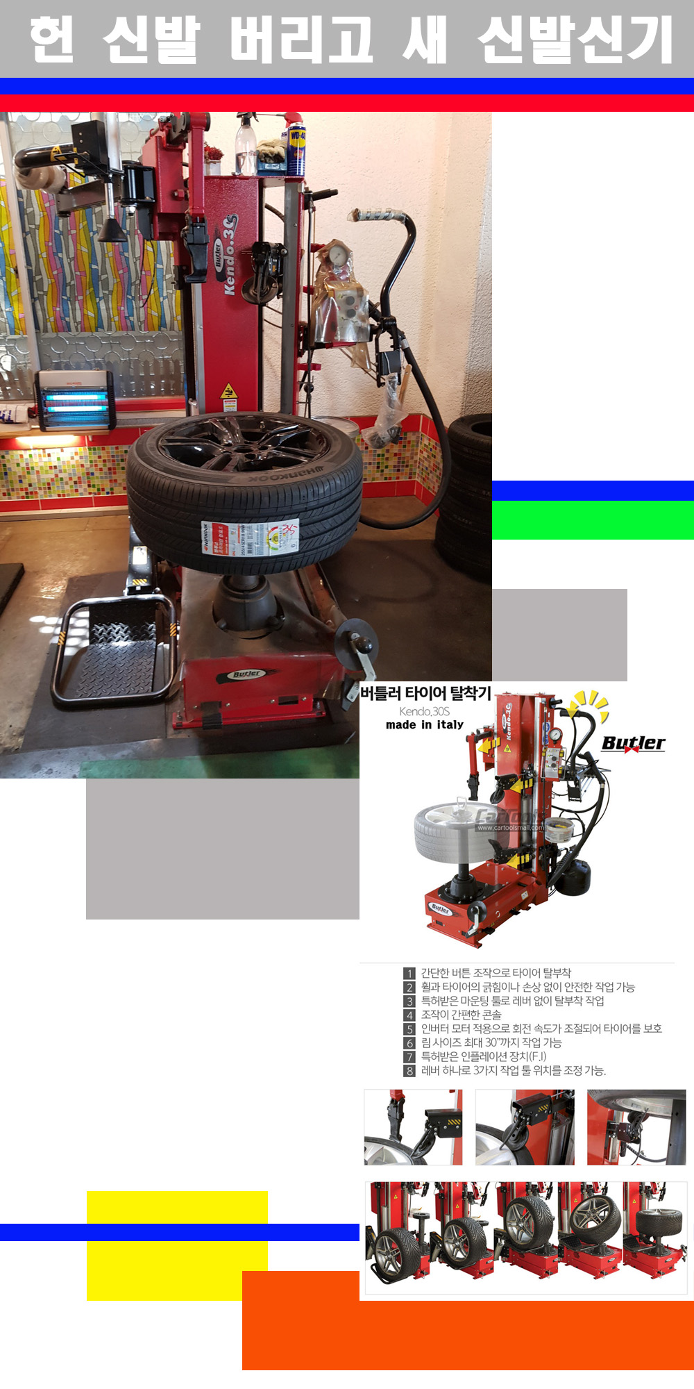 이태리 버틀러사의 켄도3.0S는 휠과 타이어와 조립과 분리시 전혀 제품에 손상을 주지않는 탈착기로 특히 센터락방식(중앙에서 휠를 고정하는 방식)이여서 휠의 중앙부위 잡아서 타이어를 탈부착하고 이후 상하롤러로 타이어를 탈부착합니다 특히 유니포미티작업(휠의 가장가벼운부분과 타이어의 가장 무거운부분을 매칭시키는 작업)시 작업자가 타이어를 정확한 지점에 휠과 매칭시킬수 있는 장점도 있습니다 유니포미티작업 불량시 과도한 진동값으로 핸들링불안 승차감저하 과도한 노면의 충격흡수를 가져와 주행감성을 해치는 첫번째 이유입니다 하지만 이런 작업을 무시하고 그냥 정적인 휠발란스작업만 하는것이 현실입니다 보통 타이어가격만 생각하시고 장착을 하시는데 꼭 이런 부분까지 챙길수 있는 샵을 권장합니다