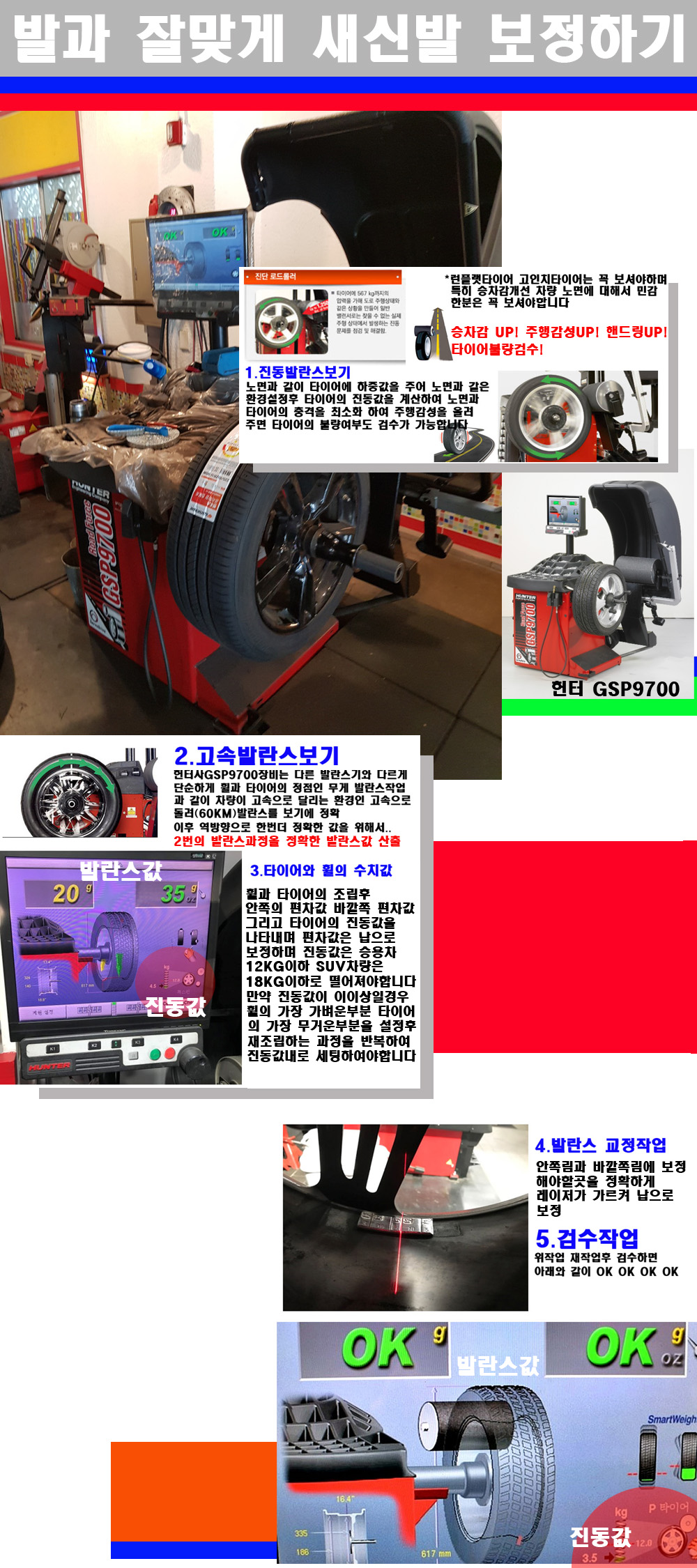 이후 미국 헌터사 GSP9700장비로 고속 및 진동발란스로 더욱더 작업의 정확도와 정밀도를 높였습니다 이장비는 노면에서 올라오는 진동값까지 계산하여 발란스값을 보는 방식으로 진동발란스기는 헌터사GSP9700장비가 유일합니다 이후 역방향으로 60키로의 고속으로 다시 발란스값을 보정하는 방식입니다 그래서 노면에서 올라오는 진동를 잡을수 있으며 특히 타이어의 노면력 측정으로 타이어의 불량여부까지도 검수가 가능한 장비입니다 특히 고속발란스 측정시 타사 발란스기와 틀리게 고속으로 발란스를 보기에 차량이 고속으로 달리는 시뮤레이션 구현이 가능하여 정확한 발란스값을 볼수가 있습니다 그리고 작업자에게는 불필요한 발란스납을 붙이지 않아 미관상으로 좋고 납을 절약하는 고객님에게도윈이고 작업자에게도 윈윈할수 있는 장비입니다 그리고 시중에서 고속진동발란스라고 말하시는 샵들이 많은데 꼭아셔야하는것은 고속발란스는 말그대로 발란스를 볼때 고속으로 돌리기에 60키로 전후 그리고 진동값을 계산하기위해서는 발란스기에 진동롤러가 있어야합니다 그래서 미국헌터사 GSP9700장비가 유일합니다 다른 샵에서 말하는 발란스기는 고속진동발란스기능없는 일반발란스 기기입니다 이점 꼭 아시고 장착하시기를 바랍니다