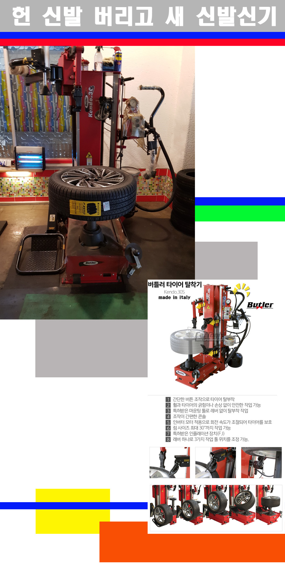 이태리 버틀러사의 켄도3.0S는 휠과 타이어와 조립과 분리시 전혀 제품에 손상을 주지않는 탈착기로 특히 센터락방식(중앙에서 휠를 고정하는 방식)이여서 휠의 중앙부위 잡아서 타이어를 탈부착하고 이후 상하롤러로 타이어를 탈부착합니다 특히 유니포미티작업(휠의 가장가벼운부분과 타이어의 가장 무거운부분을 매칭시키는 작업)시 작업자가 타이어를 정확한 지점에 휠과 매칭시킬수 있는 장점도 있습니다 유니포미티작업 불량시 과도한 진동값으로 핸들링불안 승차감저하 과도한 노면의 충격흡수를 가져와 주행감성을 해치는 첫번째 이유입니다 하지만 이런 작업을 무시하고 그냥 정적인 휠발란스작업만 하는것이 현실입니다 보통 타이어가격만 생각하시고 장착을 하시는데 꼭 이런 부분까지 챙길수 있는 샵을 권장합니다